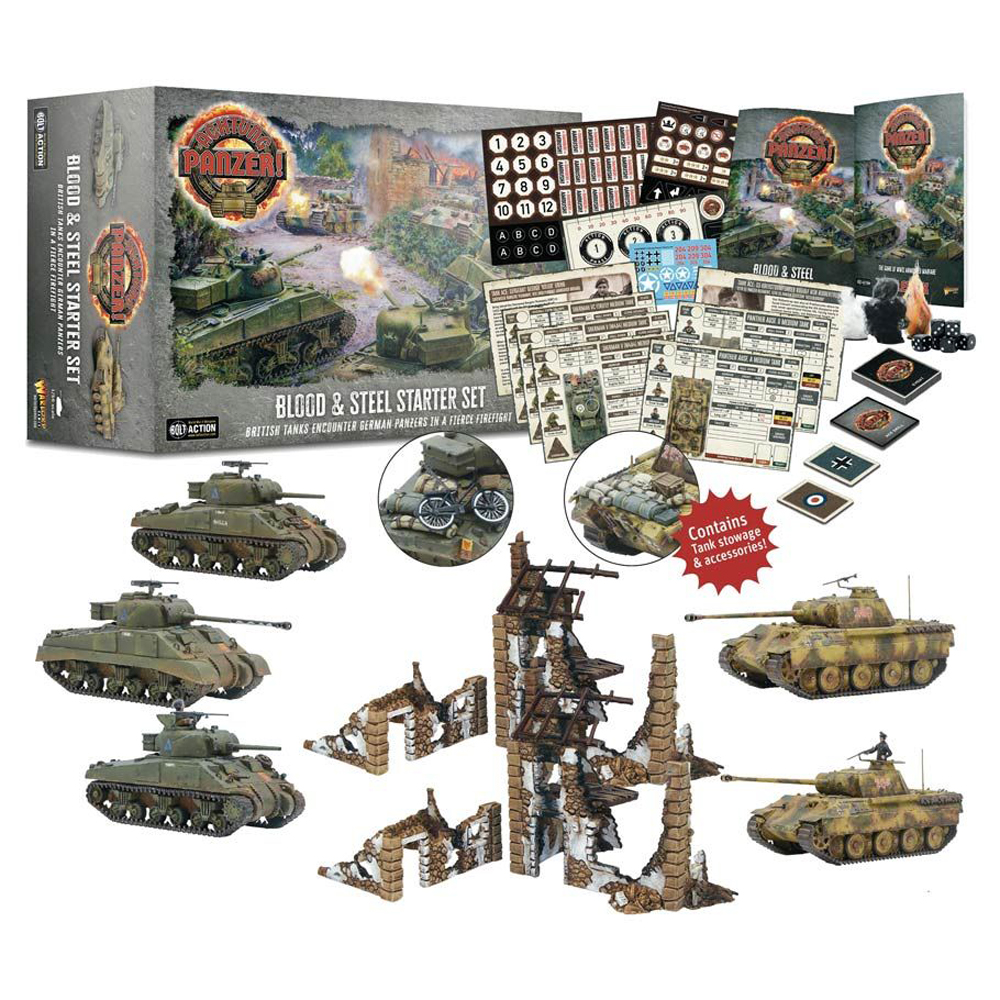 Achtung Panzer!, with a pair of mighty German Panthers facing off against a trio of British Shermans, one of which is the Firefly variant mounting the fearsome 17pdr gun. These five mighty machines are all rendered in fantastically detailed plastic kits, packed with optional extras, and can be customised even further with the included stowage packs, allowing you to make truly unique and characterful tank platoons.