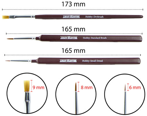 These brushes are a good set for beginners, or anyone looking for a workhorse set of brushes. The sets I have hold their tips well, and the triangle shaped handles make them comfortable for long painting sessions. These work great to lay out the base coats of paints and most of the details, then if needed I swap to my more expensive brushes for the ultra fine detail.