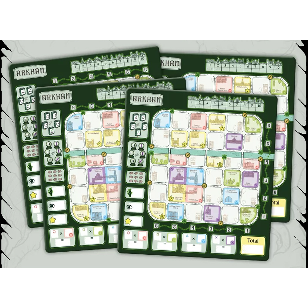Arkham Travel Guide, you become a guide and create tour routes through the grim and narrow streets of Arkham, full of Curio shops, mysterious Gates and Horrible places. During the game, players roll and collectively choose dice that determine where players can draw tourists and chart routes.