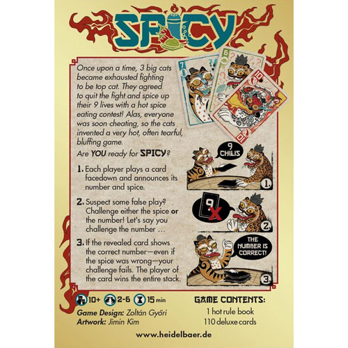 Spicy is a terrific bluffing game that takes little to no time to setup and plays quickly. Spicy is an upgraded version of the classic kids game Bull$%&!, but with some key differences that improve the gameplay. The game has three suits, numbered 1-10 and players take turns either passing (and drawing a card) or playing a card face down and announcing the suit/number. You have to claim to play cards in ascending order, but my favorite rule is that when you want to call someone out you have to announce whether they are lying about the suit or the number. This is a small change that has a large impact on the game since you still have a chance to get away with your bluff. There are also wild cards that are either wild for suit OR number, so even with a wild you aren't completely safe. Great family game, plays quickly and had everyone laughing and yelling almost right away.