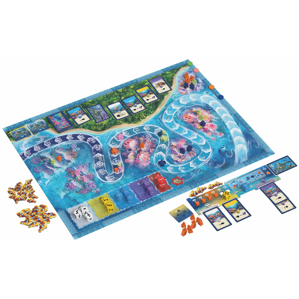 Off the east coast of Australia is an underwater superhighway, a warm stretch of ocean called the East Australian Current. Here, your sea turtles swim amidst beautiful flora and fauna. Each round you choose dice which offer various advantages in this diverse ecosystem: select food cubes to feed ever-growing schools of fish, settle corals onto reefs, swim further down the current with your sea turtles or choose to be the first player to pick dice in the next round.