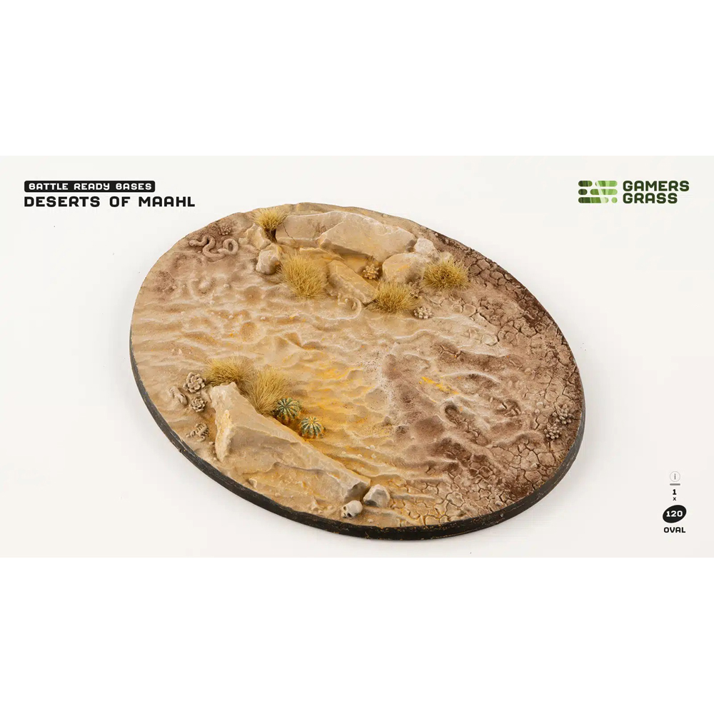 This blister contains 1 thermoplastic 120mm wide oval Battle Ready Base, in a Deserts of Maahl theme. The bottom slots are compatible with magnets sizing up to 6mm in diameter and 1mm thick. Magnets are not included. All Battle Ready Bases are sold already painted and finished by hand.