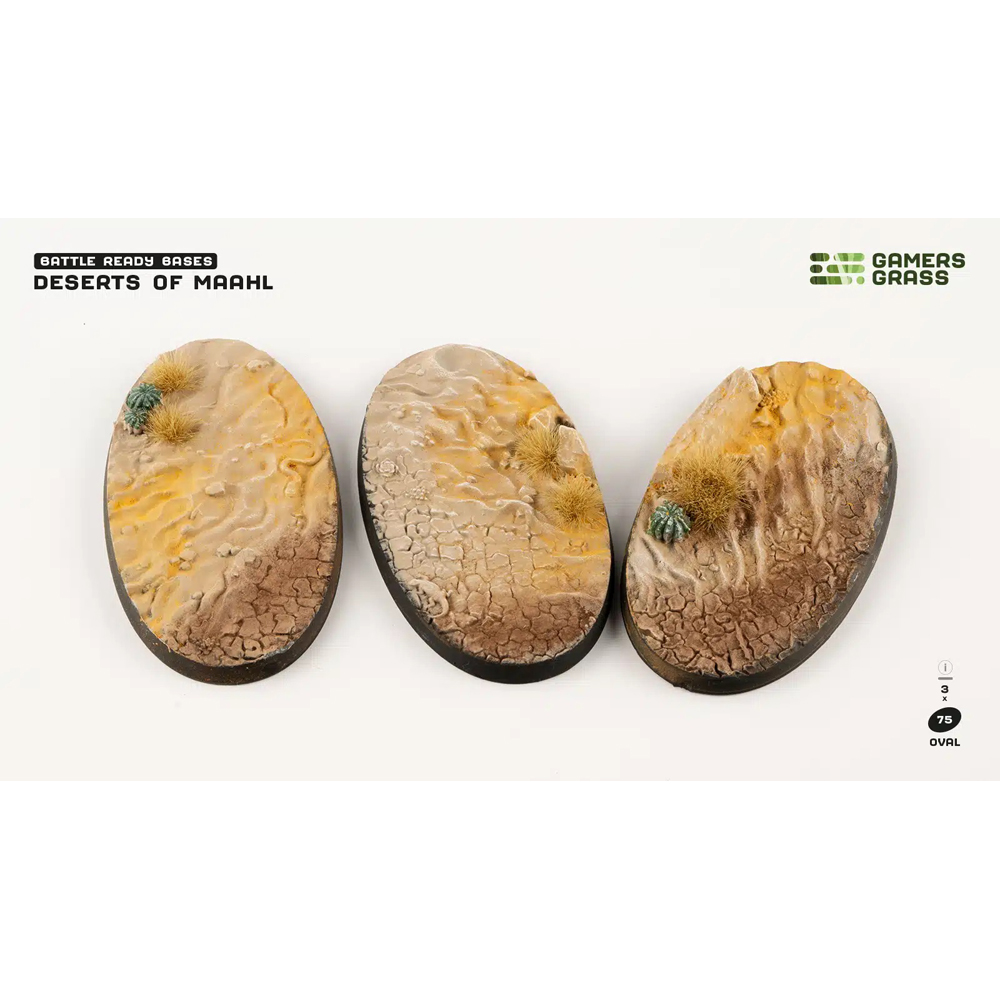 This blister contains 3 thermoplastic 75mm wide oval Battle Ready Bases, in a Deserts of Maahl theme. The bottom slots are compatible with magnets sizing up to 6mm in diameter and 1mm thick. Magnets are not included. All Battle Ready Bases are sold already painted and finished by hand.