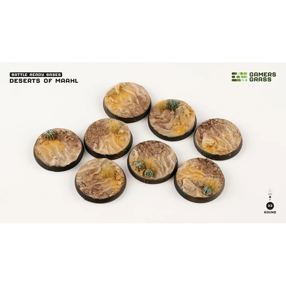 This blister contains 8 thermoplastic 32mm wide round Battle Ready Bases, in a Deserts of Maahl theme. The bottom slots are compatible with magnets sizing up to 6mm in diameter and 1mm thick. Magnets are not included. All Battle Ready Bases are sold already painted and finished by hand.