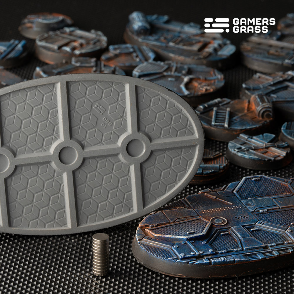 This blister contains 2 thermoplastic 90mm wide oval Battle Ready Bases, in a Spaceship Corridor theme. The bottom slots are compatible with magnets sizing up to 6mm in diameter and 1mm thick. Magnets are not included. All Battle Ready Bases are sold already painted and finished by hand.