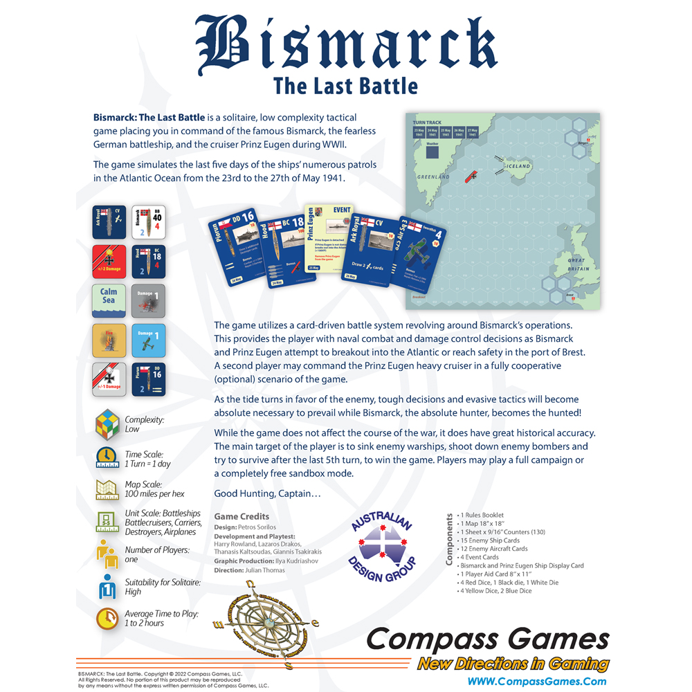 This is a light wargame regarding the detection and clash with the battleship Bismarck in the Atlantic during WWII. Fine components, mounted map and fast play. The rule book needs a revision because info is scattered all over the game (map, player aids, rules booklet, cards). After trial and error play is smooth and can finish in an hour.