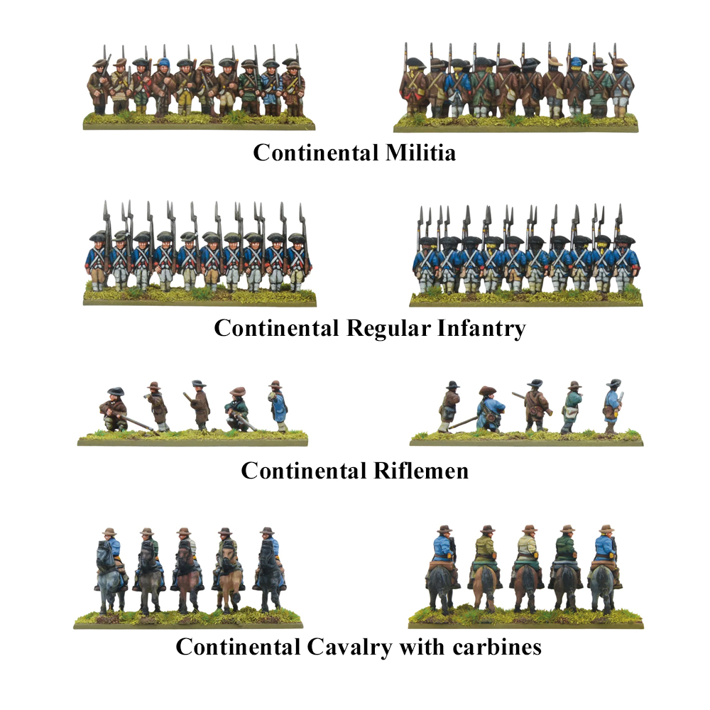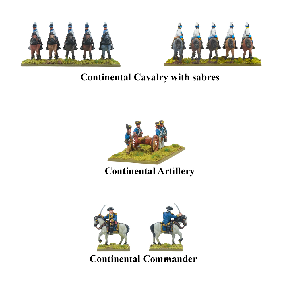 Black Powder Epic Battles: Revolution! American force, or expand an existing collection. Inside, you'll find Continental Regular Infantry, Militia, Riflemen, and cavalry, as well as a quartet of commanders to lead them, and a cannon for fire support, plus bases, a painting guide, and flag sheet.