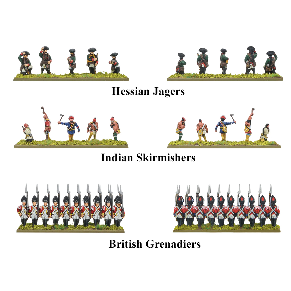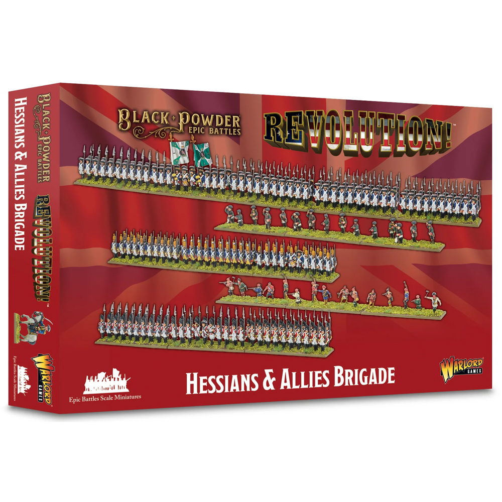 March in support of the British cause with this plastic Brigade boxed set. This box is the perfect way to start a Black Powder Epic Battles: Revolution! force of Hessian auxiliaries, or support an existing British collection. Inside, you'll find Hessian Musketeers, Grenadiers, and Jaegers, as well as a small unit of Native Americans in British service, and the legendary British Grenadiers, plus bases, a painting guide, and flag sheet.
