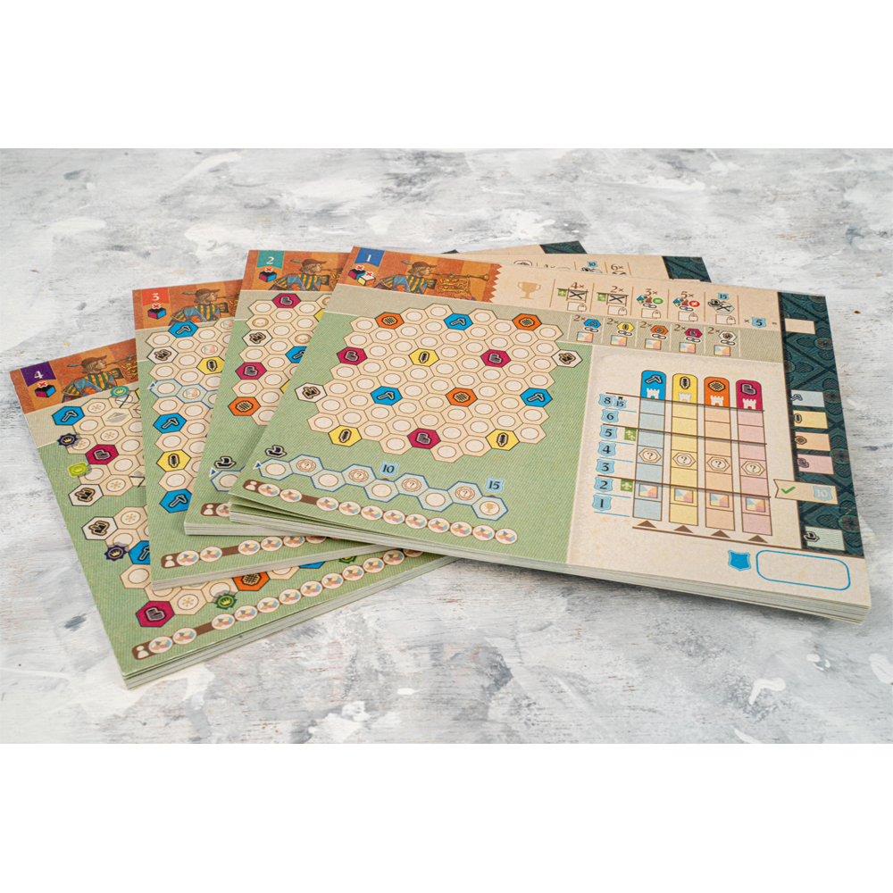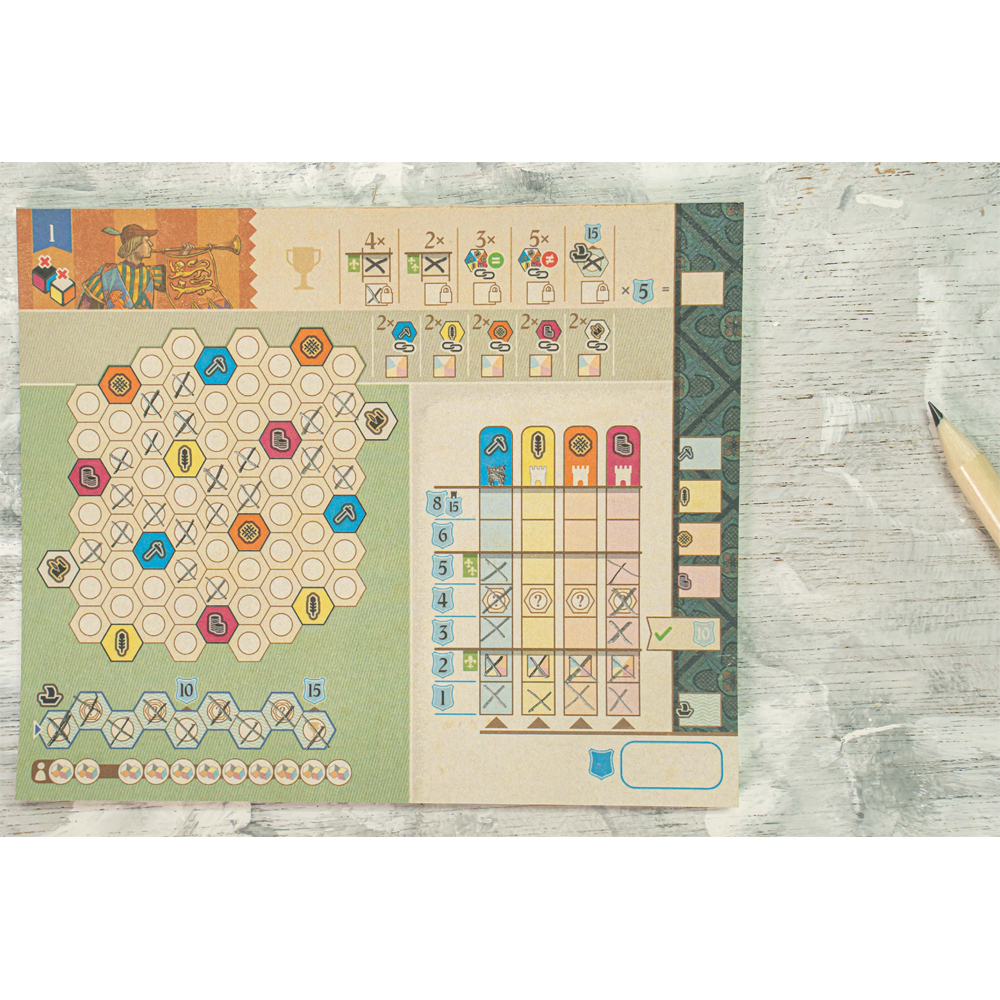 By reaching towns with groups of filled in spaces, players will trigger town scoring in the book of successes on their sheet. If players plan their routes wisely, these escalating successes can trigger a cascade of combos to give them a competitive edge in earning the public achievements and private bonuses.