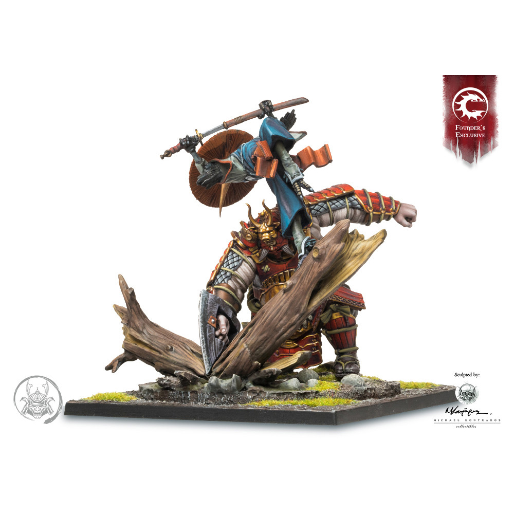 This Diorama, Sculpted by Michael Kontraros, includes 2 miniatures, and all the bases you need to display them on your shelf or the field of battle. The models included can be fielded either as a Daimyo or Oyabun to reflect the myriad paths to Enlightenment that the Yoroni may tread. These are a numbered edition, Founder's Exclusive, run of 1337 units.