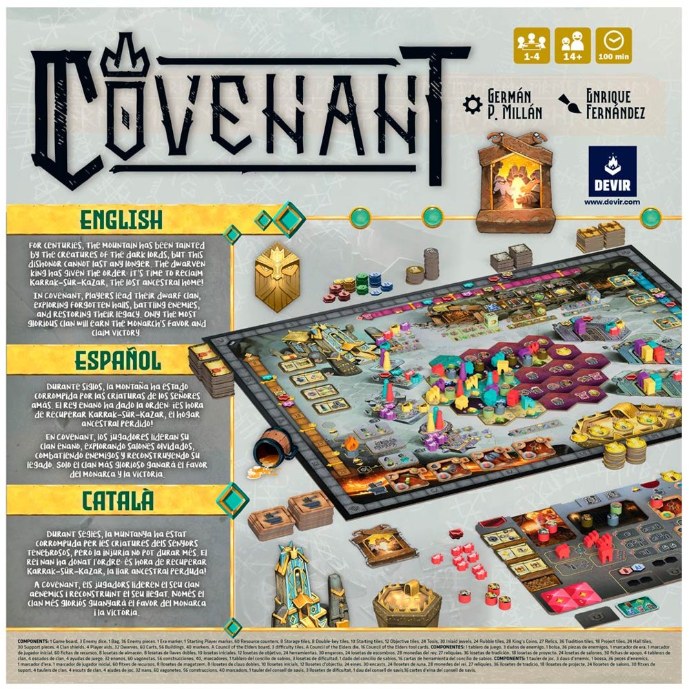 Covenant is played in turns over three ages. During their turn, players will assign the Dwarves of their clan to different tasks that will allow them to explore the ancient halls of the ancestors and drive out their enemies while rebuilding their ancestral home. Your dwarf tokens and tools will allow you to do all kinds of actions: dig into the mountain, defeat the enemies that live there, and build all kinds of buildings that will bring the legendary dwarf city back to life. At the end of the game, the clan that has accumulated the most glory will take the recognition of the monarch and the victory.