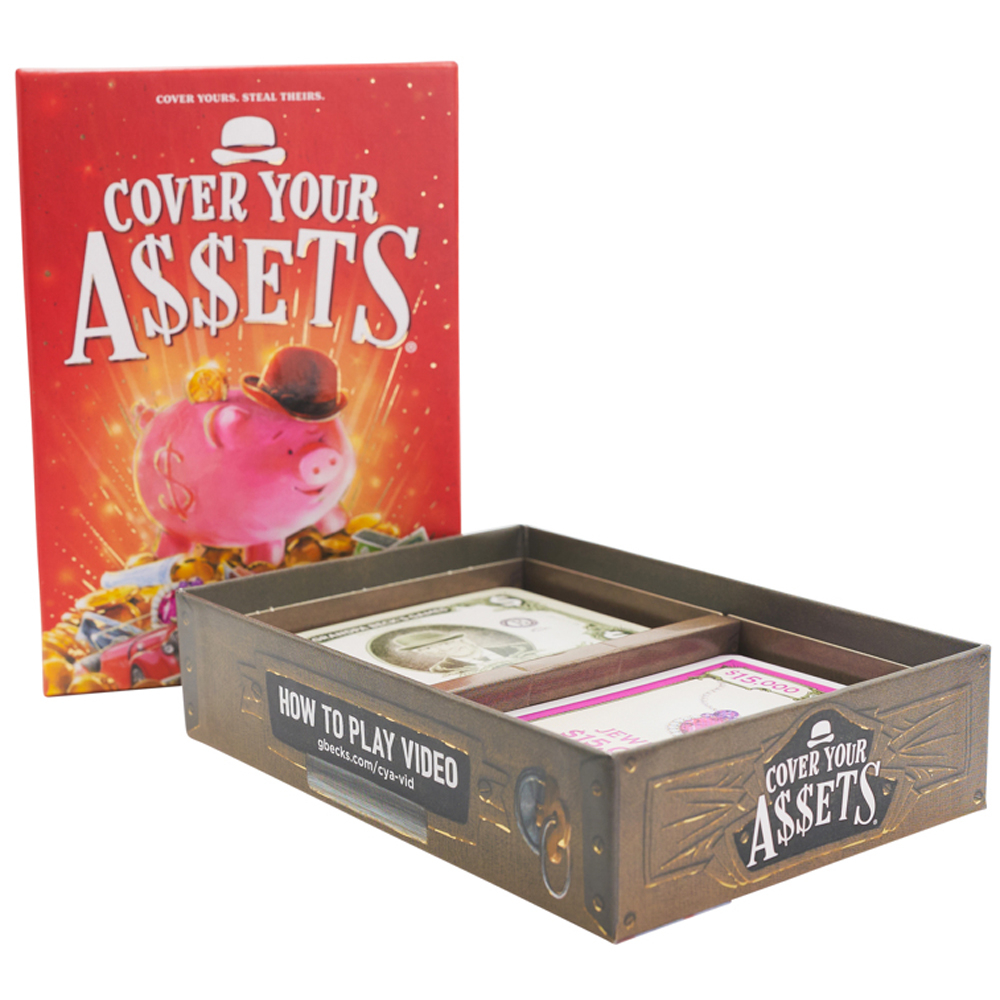 Cover Your Assets is a highly competitive set-collecting card game where players steal, scheme, and cover your assets to amass a fortune. Assets can change hands with every turn, and no fortune is safe until the last card is played! Begin by collecting and building a stack of matching pairs of assets. Be careful, though - the top set can be challenged and stolen by other players, who add to it and make it even more valuable.