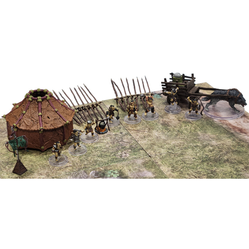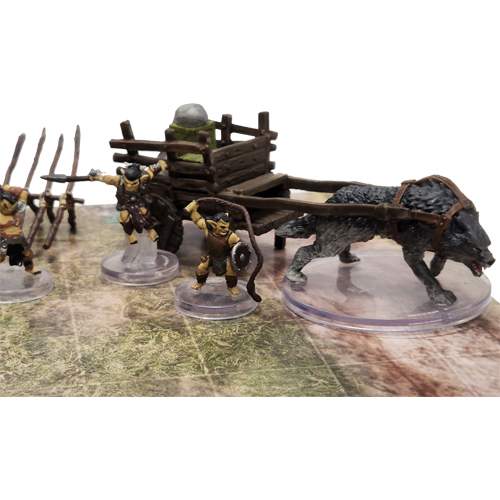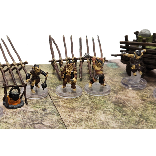 Adventure in a Box- Goblin Camp! Inside you will find 9 pre-painted miniatures, 8 different camp dressings (including two fire pit configurations), and a double-sided, slide-together tiled battle map to build out your very own goblin themed adventure. Whether your next clash with goblins it is a brief encounter or a drawn out scenario, the