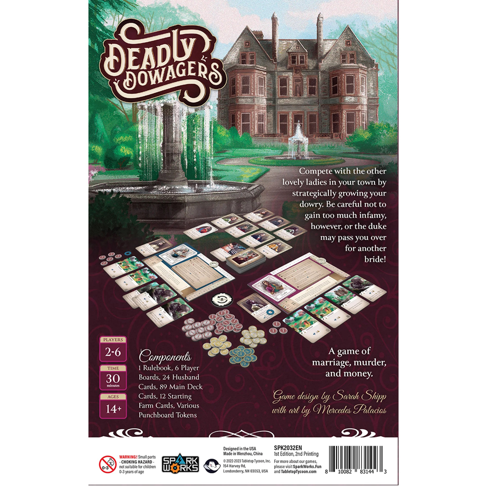Deadly Dowagers is a game of marriage, murder, and money. You compete with the other lovely ladies in your town by strategically growing your dowry, while being careful not to gain too much infamy, or the duke may pass you over for another bride!