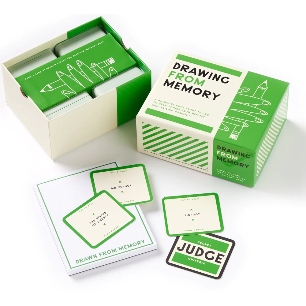 Includes a pad of paper and 550 prompt cards, each featuring a different well-known character, animal, or object to try to draw from your memory alone - and fail at in hilarious fashion.