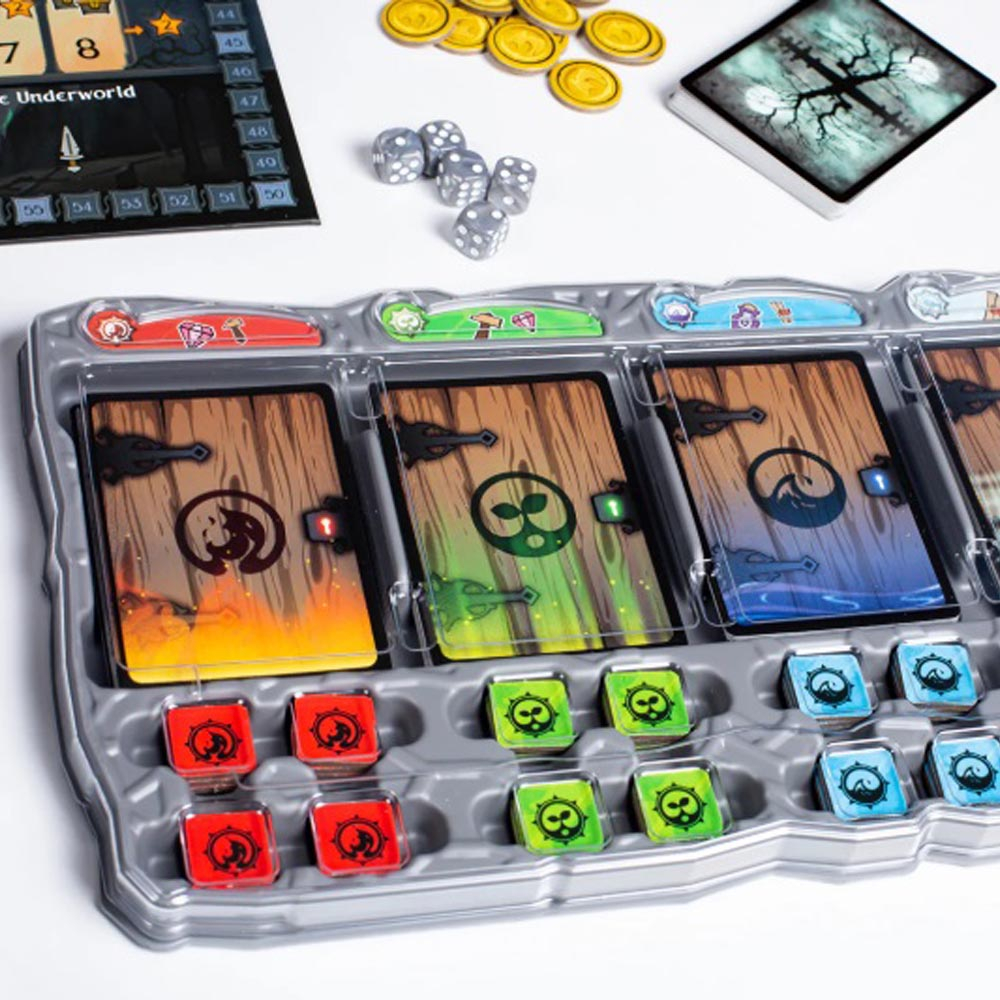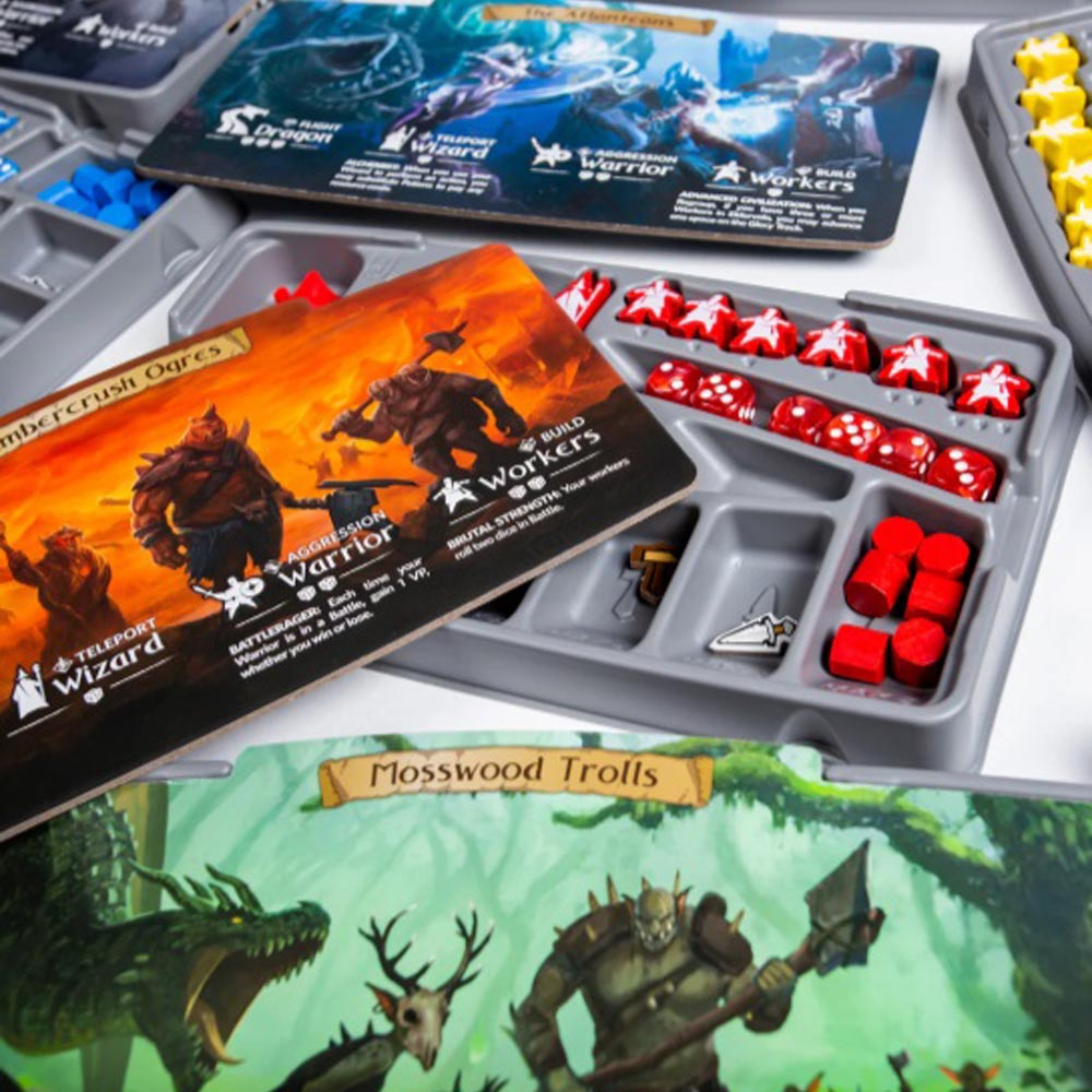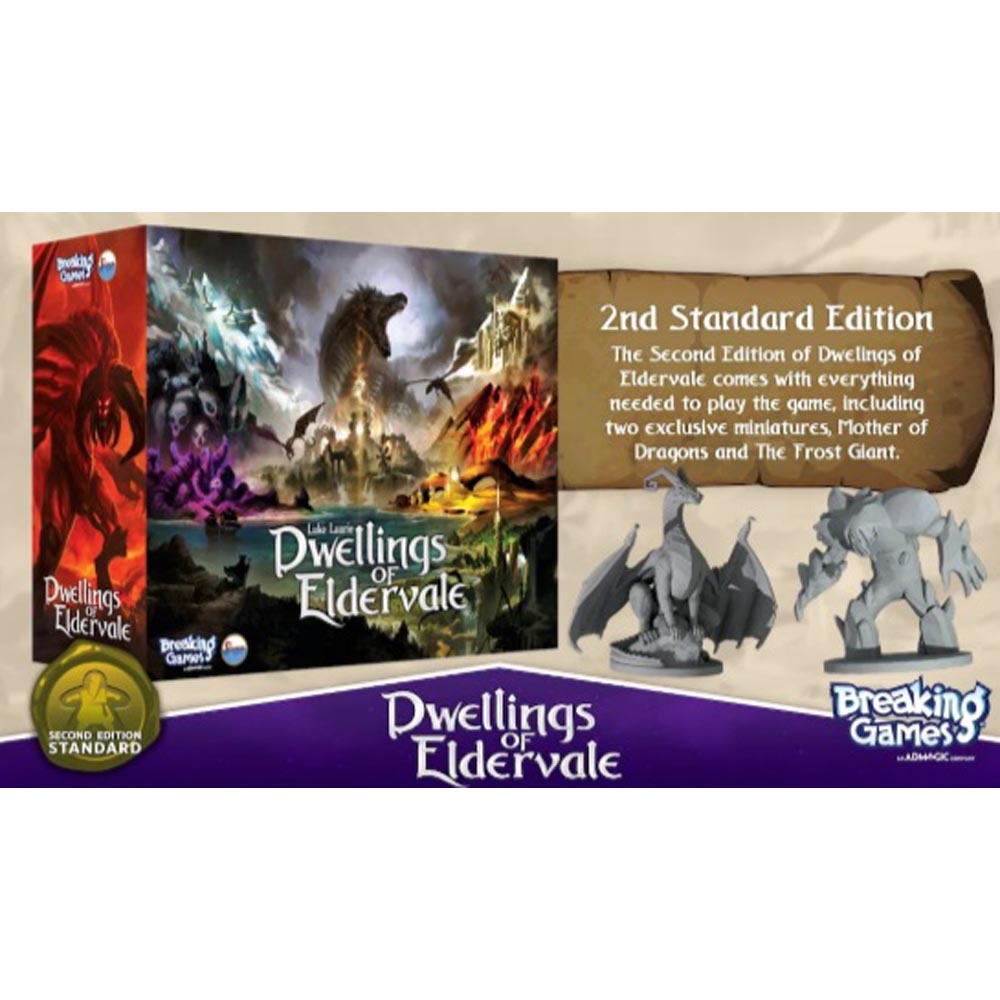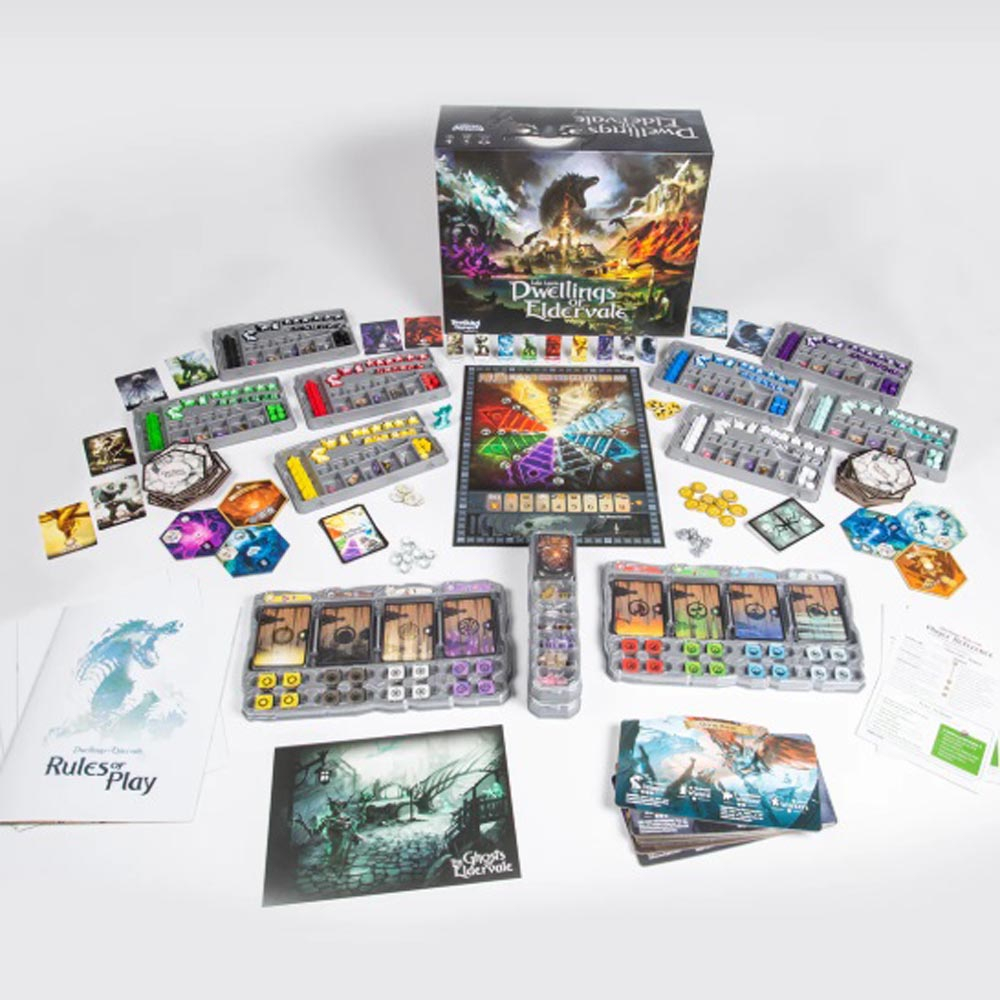 Dwellings of Eldervale blends worker placement, area control, engine building and unique worker units. Players take turns placing a worker in Eldervale or regrouping and activating their tableau of adventure cards. Action spaces include realms key to power: a summoning portal, an ancient mill, the lost fortress, deep dungeons, and a crumbling mage tower and the elemental lands of Earth, Air, Fire, Water, Light, Dark, Order and Chaos! Magic cards grant spells, quests and prophecies to players.