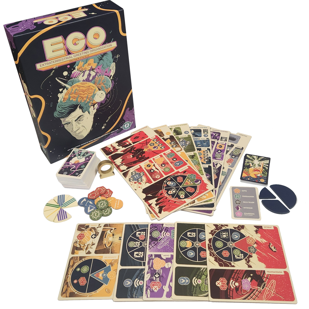 EGO, players proceed through a sequence of major and minor events including auctions, drafts, risks, and more. Risks and egos are the lifeblood of this game as players will frequently find themselves in a game of chicken with their rival ambassadors as they try to impress various alien civilizations and earn political power. At the end of the game, players earn significant bonus points or suffer serious penalty points depending on how offensive the aliens find them to be. Ultimately, the ambassador with the most prestige and respect will earn a seat in the Galactic Senate and be crowned the winner of the game.