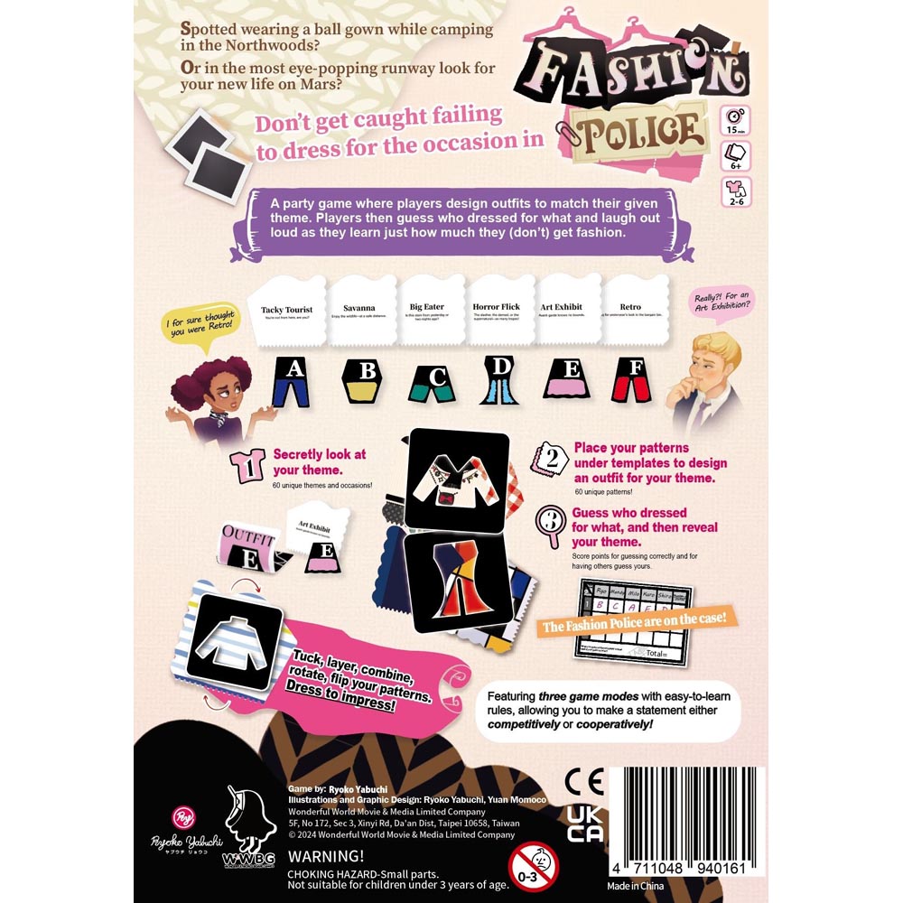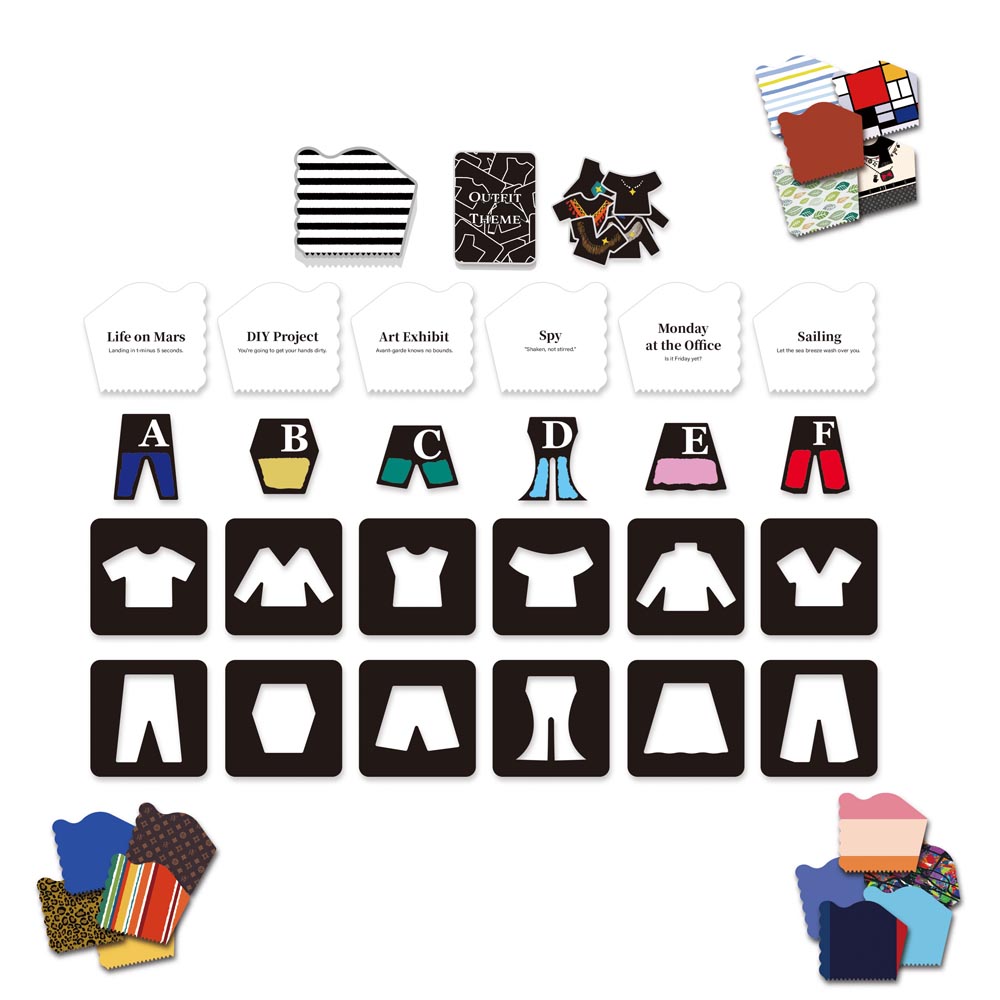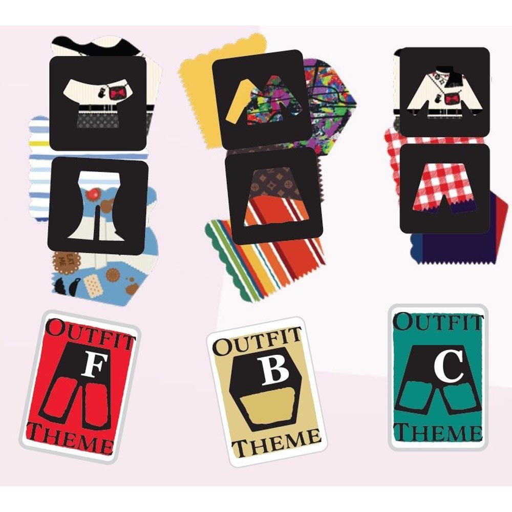 Fashion Police is a party game that offers three game modes (including both competitive and cooperative play). Regardless of which ruleset you choose, players are first given a theme/occasion (60 unique ones including tacky tourist, apocalypse, Monday at the office, too young for your age, etc.) for which they need to design an outfit. Players then place, layer, combine, rotate, flip, etc. their randomly drawn pattern cards (60 unique options) under clothing templates to create their look-creativity knows no bounds! Players finally guess who dressed for which occasion to score points.