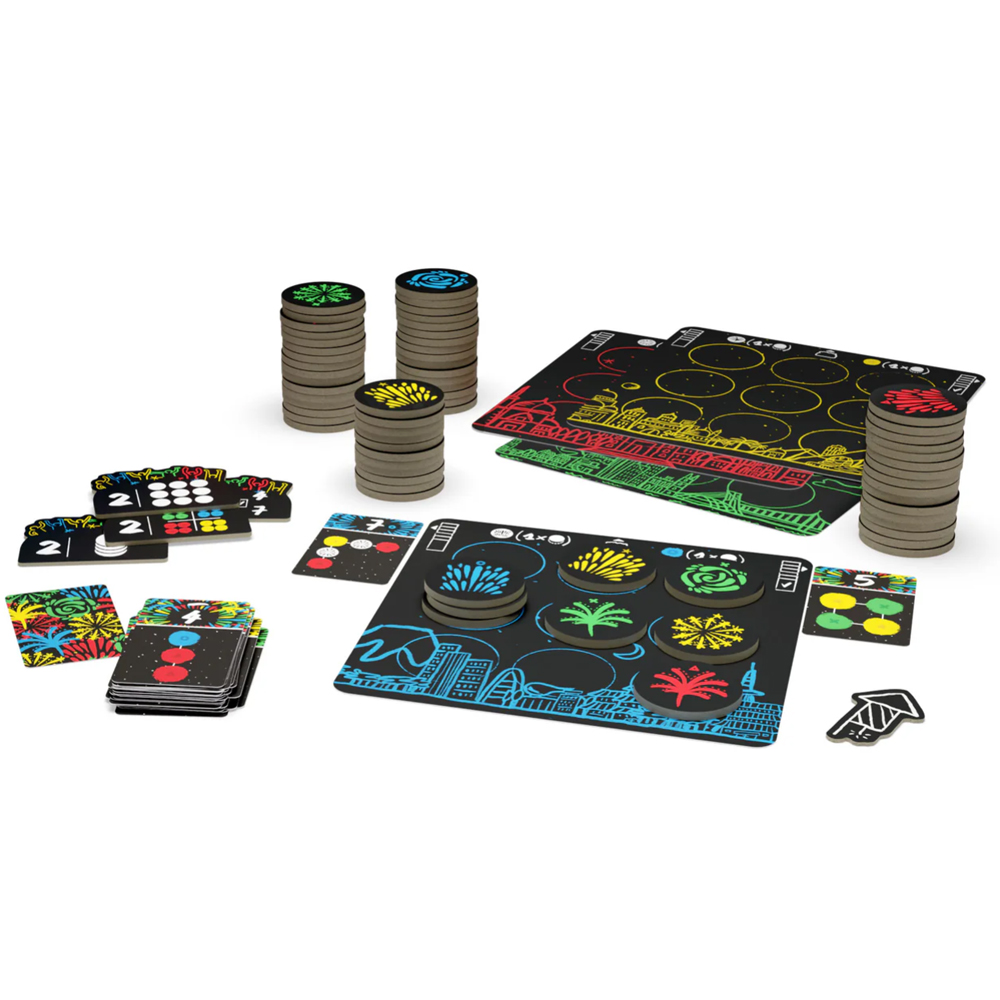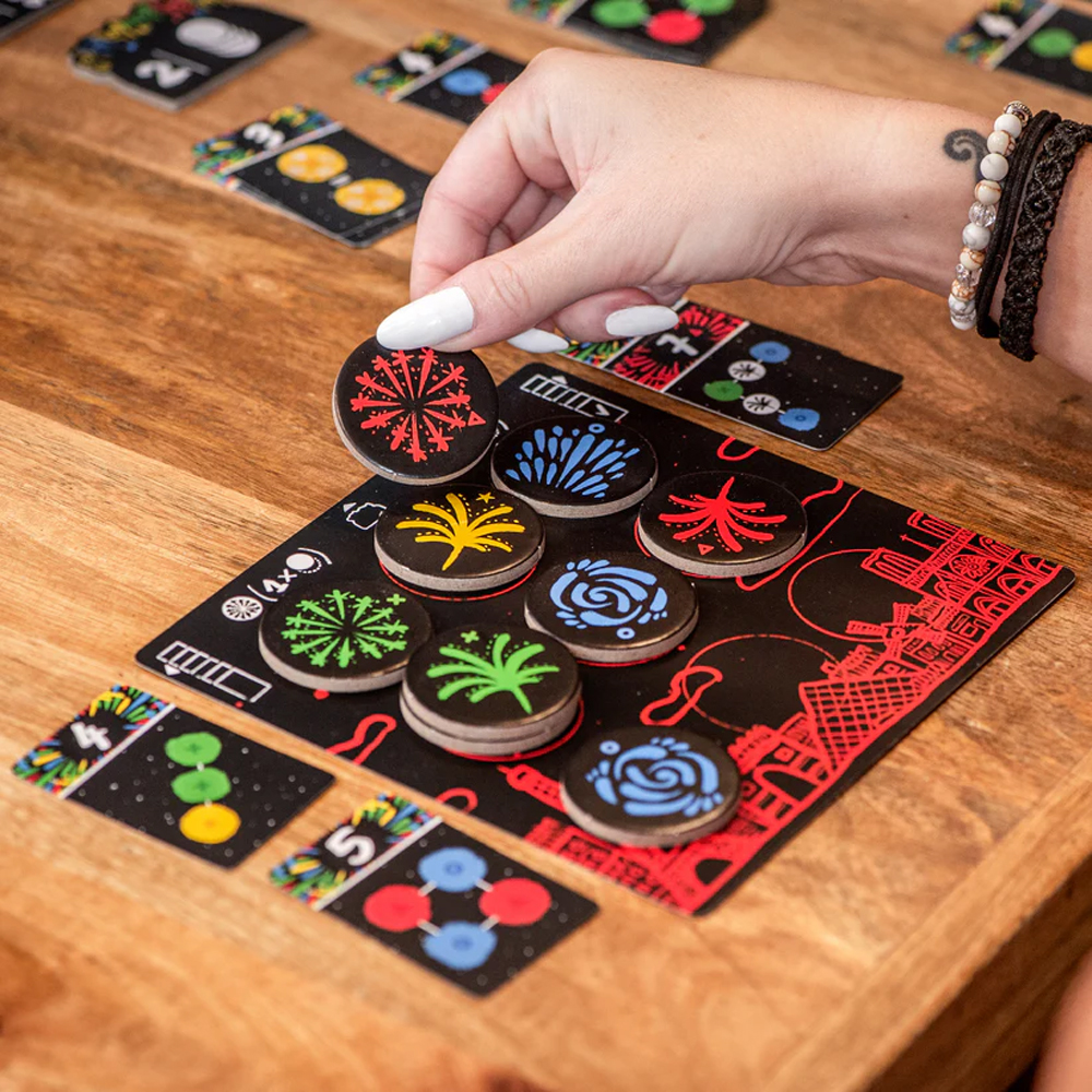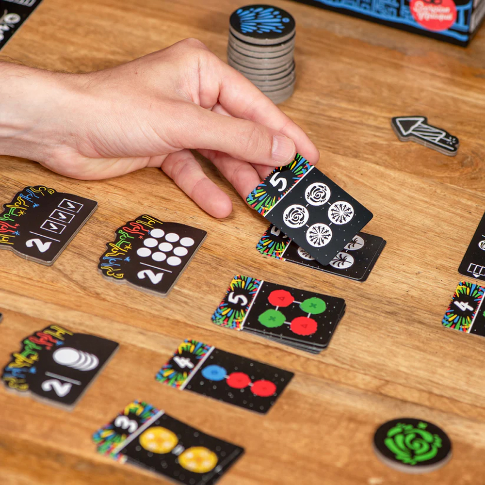 Festival, you select tiles to place on your tableau to create the most impressive and beautiful fireworks display possible . . and of course, score the most points! This tile-placement and tile-stacking game will have you choosing to either take and place a firework tile on your turn, or select an objective card to complete for points at game's end.