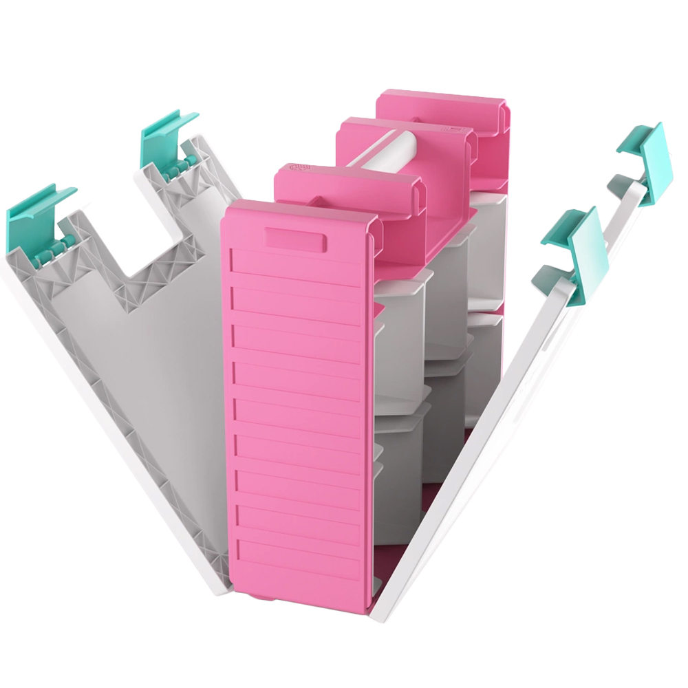 Magic Commander Decks (6x 100 double-sleeved cards), tokens, dice, movement/range tools, and many other gaming accessories! One side of the box houses six removable card holders for 600 double-sleeved cards in Thick Inner Sleeves or 800 board-game-sleeved cards. The other side holds 19 removable trays in 5 different sizes, including an extra-long tray to store movement/range tools, two trays in Mini-American card size, and two in Standard Card Game size. The trays can be swapped with those from the Gamegenic Token Silo and the Token Silo Cards Add-on, offering many different size and color combinations. The innovative clip mechanism ensures precise and secure closure.