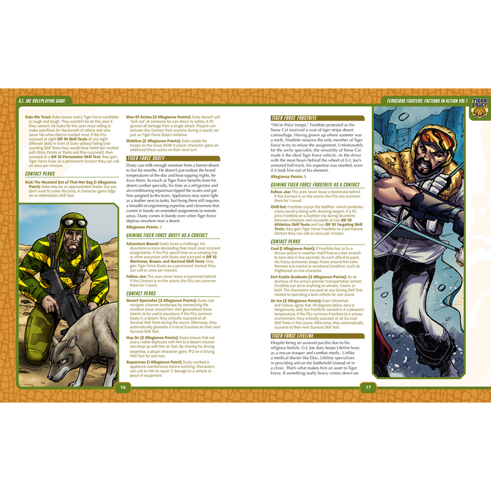 Ferocious Fighters: Factions in Action Vol. 1 introduces seven new factions for the G.I. JOE Roleplaying Game: G.I. Joe's Tiger Force, Anti-Venom Task Force, Dino Hunters, and Mega Marines teams, along with Cobra's Python Patrol, Cobra-La, and Mega-Monsters!
