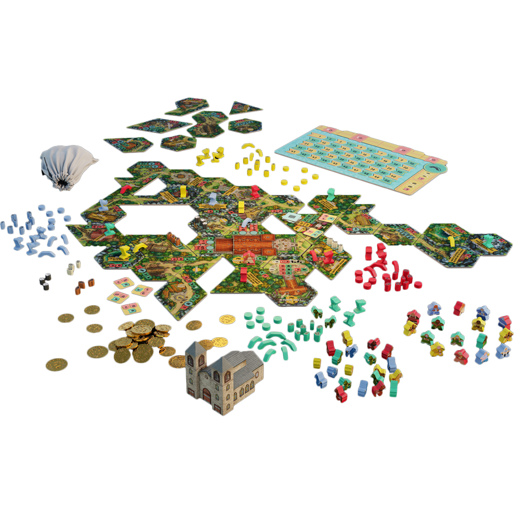 In this tile-placing game with an emergent economy, players construct buildings that everyone can use in order to create materials, refine resources, earn money, and make important deliveries to construct the Hamlet's big landmark - the Church.