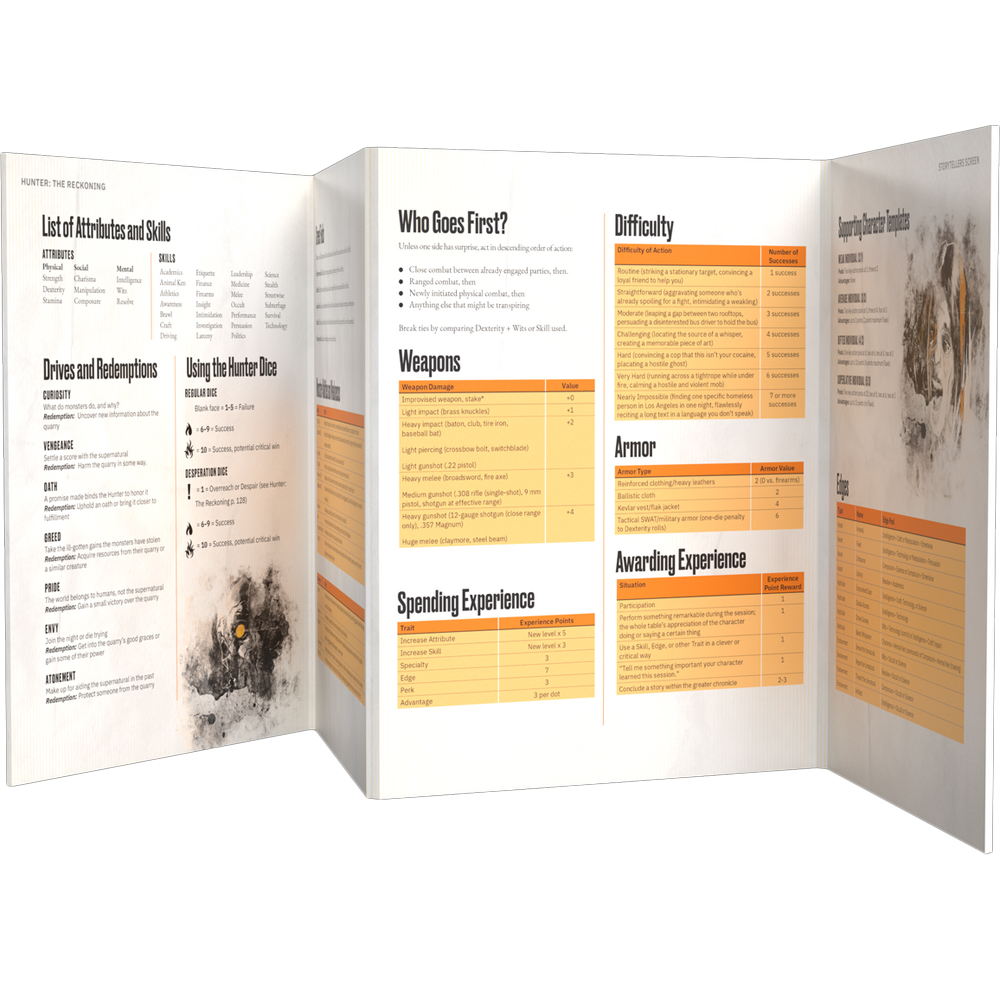 Useful info on the screen for the storyteller, such as XP spending, Weapon damage, etc Also the booklet has ways to rule things in combat such as All out attacks, targeted strikes, firearms in close quarters