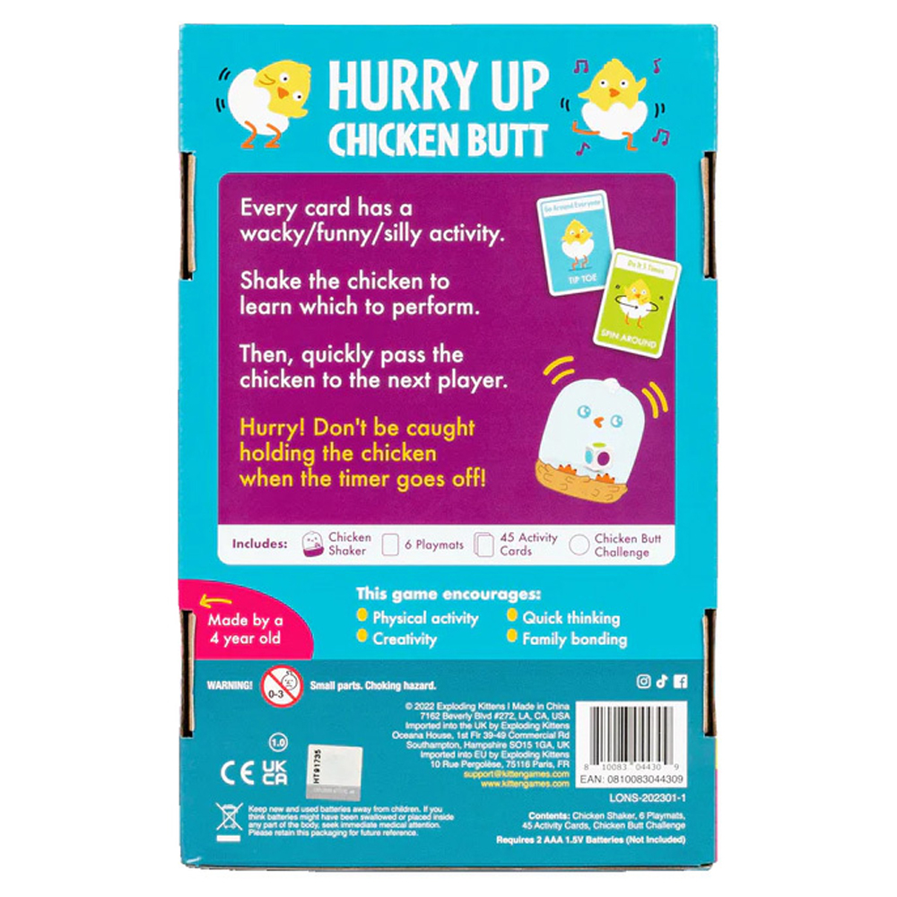 Shake the Chicken to reveal your activity, then quickly perform it before passing the Chicken Shaker to the next player. Don't get caught holding the Chicken when the timer goes off! This game is fast, funny and it's different every time. Plus, everyone has an equal chance to win, especially the little ones!