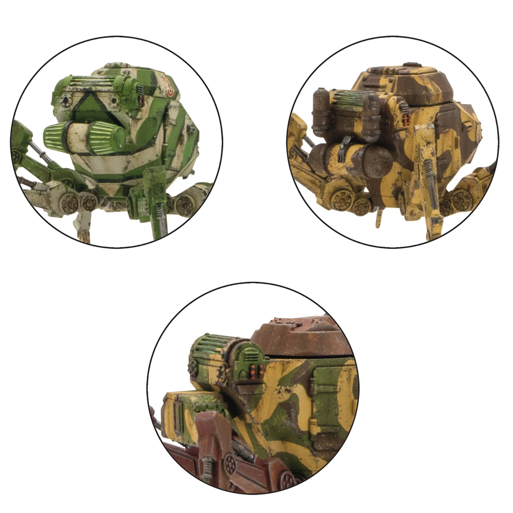 Backing them up is an Armoured Platoon, with a scuttling Vogelspinne light walker ranging ahead of the line. This fast, versatile walker can be equipped with a wide variety of weaponry to fulfill different missions, and makes up for its light armour with serious mobility. Alongside it strides a Panzer IV Ausf. X. Marrying the proven Panzer IV chassis to six powerful legs and a Schwerefeld gravitational projector, this walking tank can crush enemy infantry and vehicles alike - literally - both at range and up close.