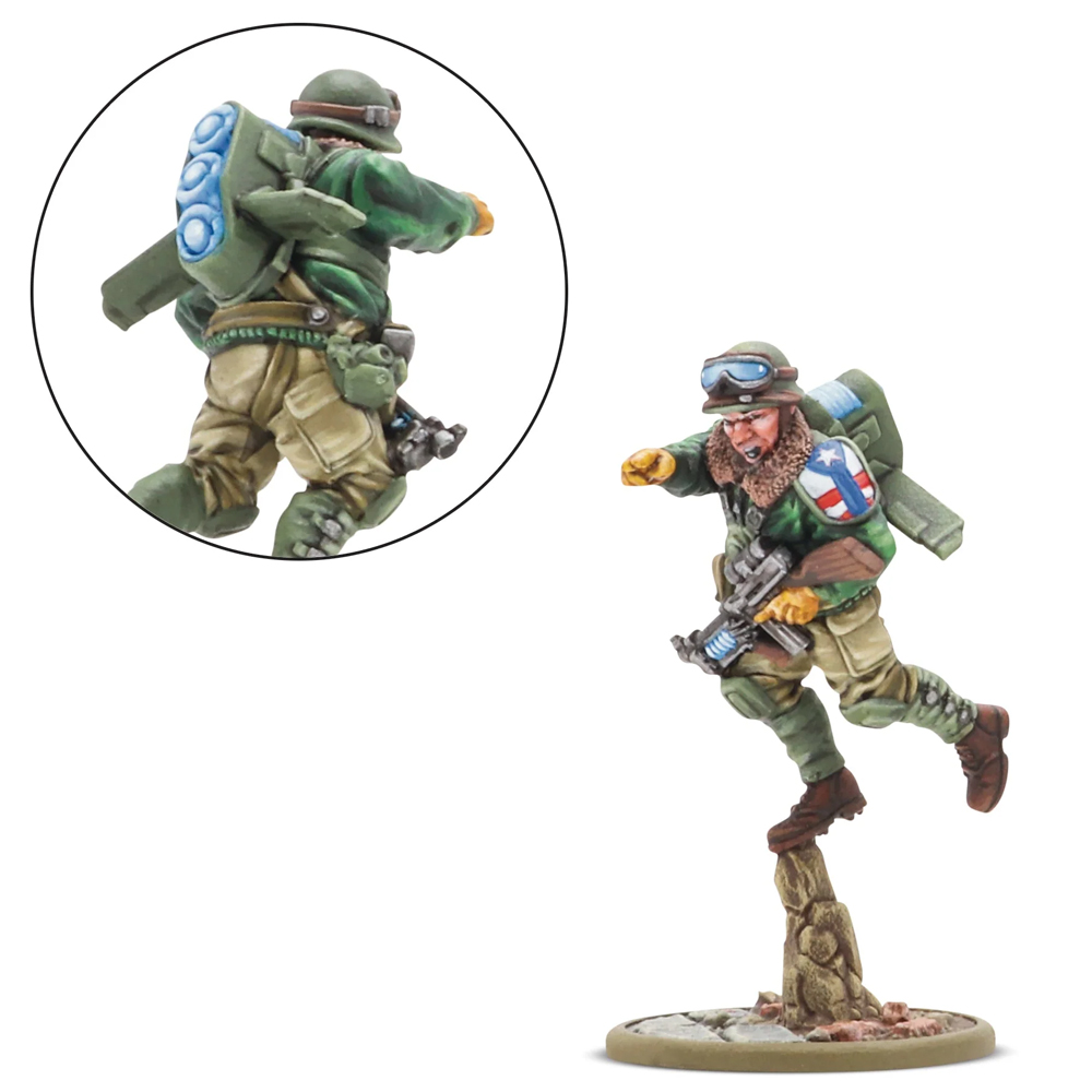This starter set contains everything you need to start playing Konflikt '47 - rulebook, models, dice, scenery, and more. Elite United States Firefly jump infantry, supported by the armoured punch of a Linebacker walker, drop from the skies into combat against hulking Axis Stahltruppen heavy infantry and a scuttling Vogelspinne light mech - the perfect introduction to the lethal battlefields of Konflikt '47 and the foundation of a pair of powerful forces. In addition, each force is led by a powerful hero figure, unique to this set!