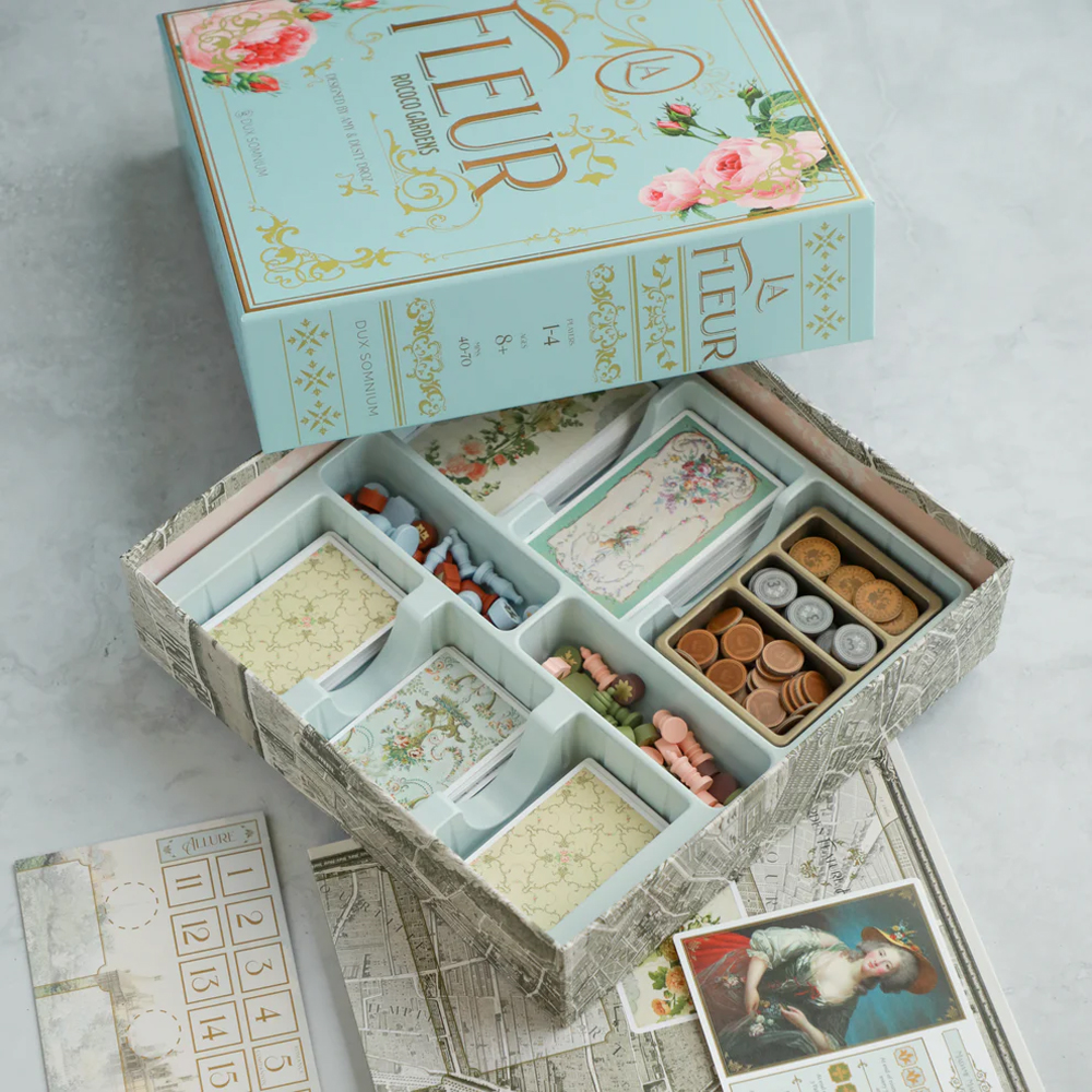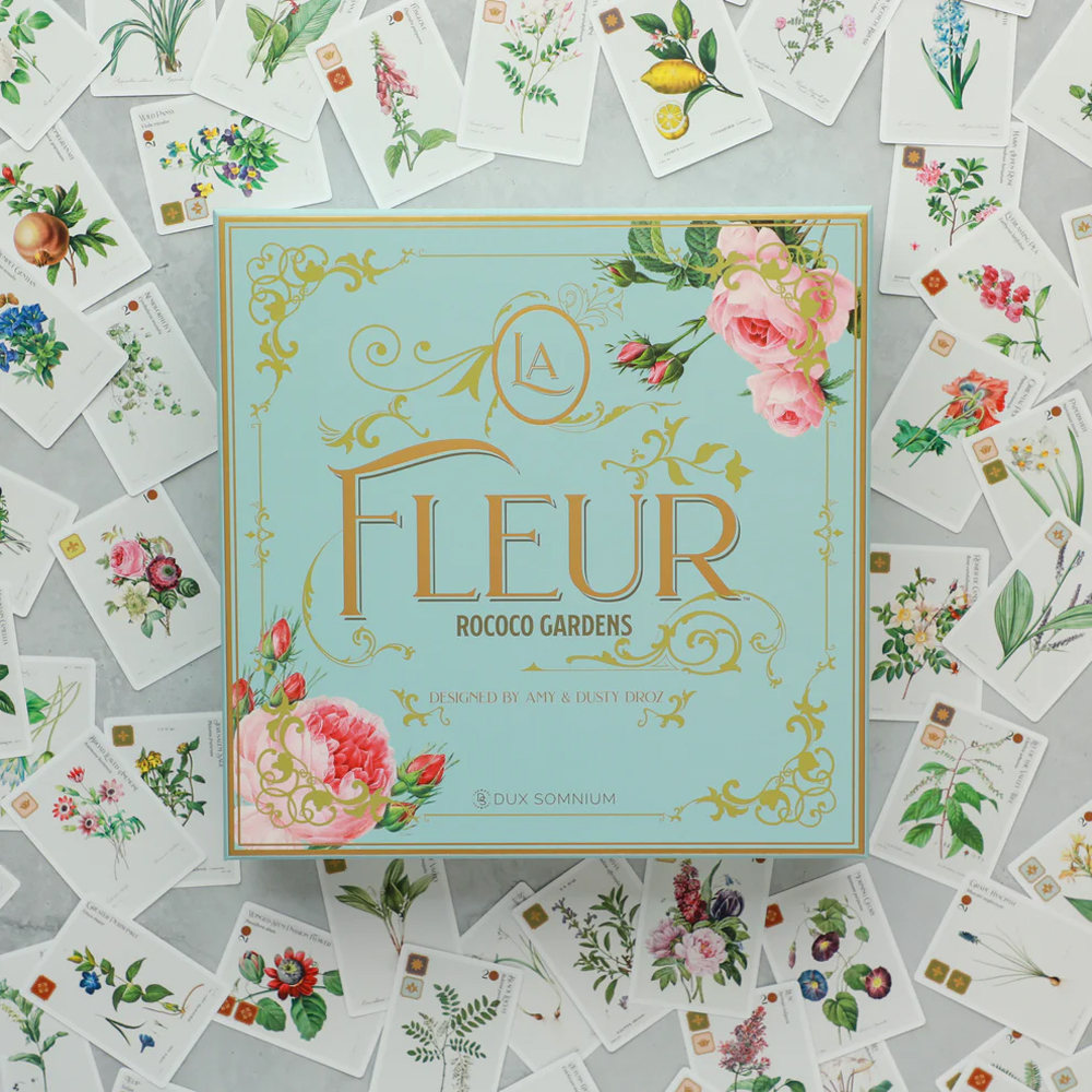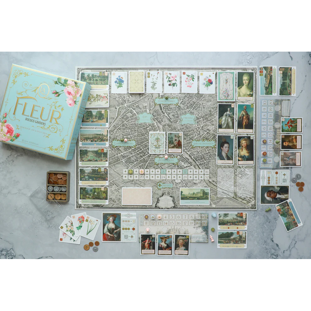 La Fleur is a strategy board game where you take on the role of a French Rococo garden enthusiast as you build your château, host garden parties, and gain enough prestige so you can hold the greatest of all garden gatherings, the Grande Soirée.
