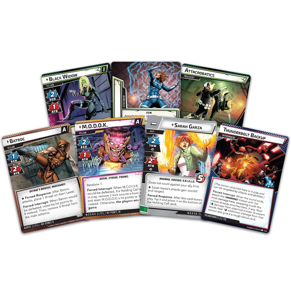 Includes 2 complete pre-built Hero Deck (Maria Hill and Nick Fury) and 5 scenarios featuring Black Widow, Batroc, M.O.D.O.K., and the Thunderbolts