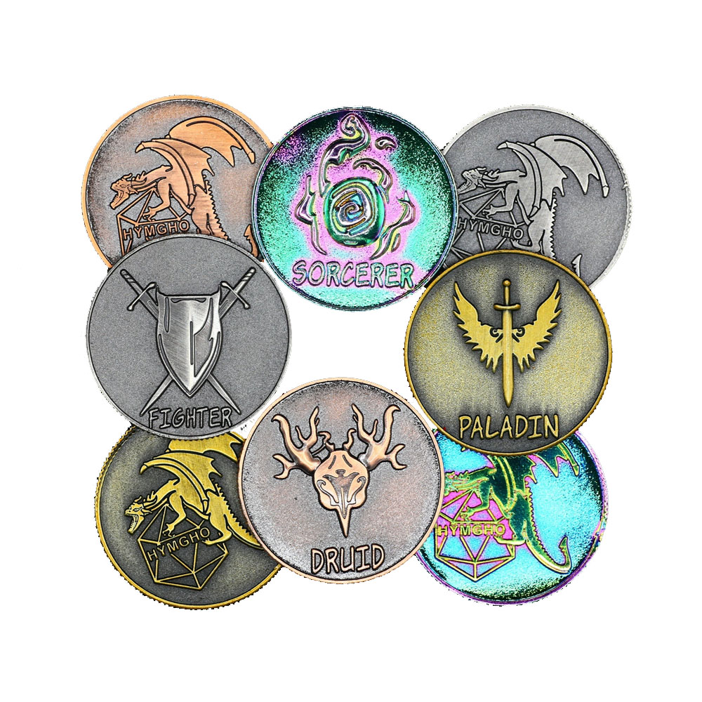 Includes 12 D&D 5E class coins: barbarian, bard, cleric, druid, fighter, monk, paladin, ranger, rogue, sorcerer, warlock, and wizard with each HYMGHO logo on the backside. Track characters in any table top games with these amazing tokens!