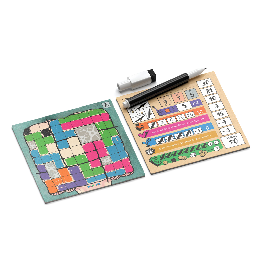 Mind Space is a thoughtful game in which players are trying to seek calm and peacefulness by adding pursuits to their brains. Each pursuit is represented by a polyomino shape of a certain color: