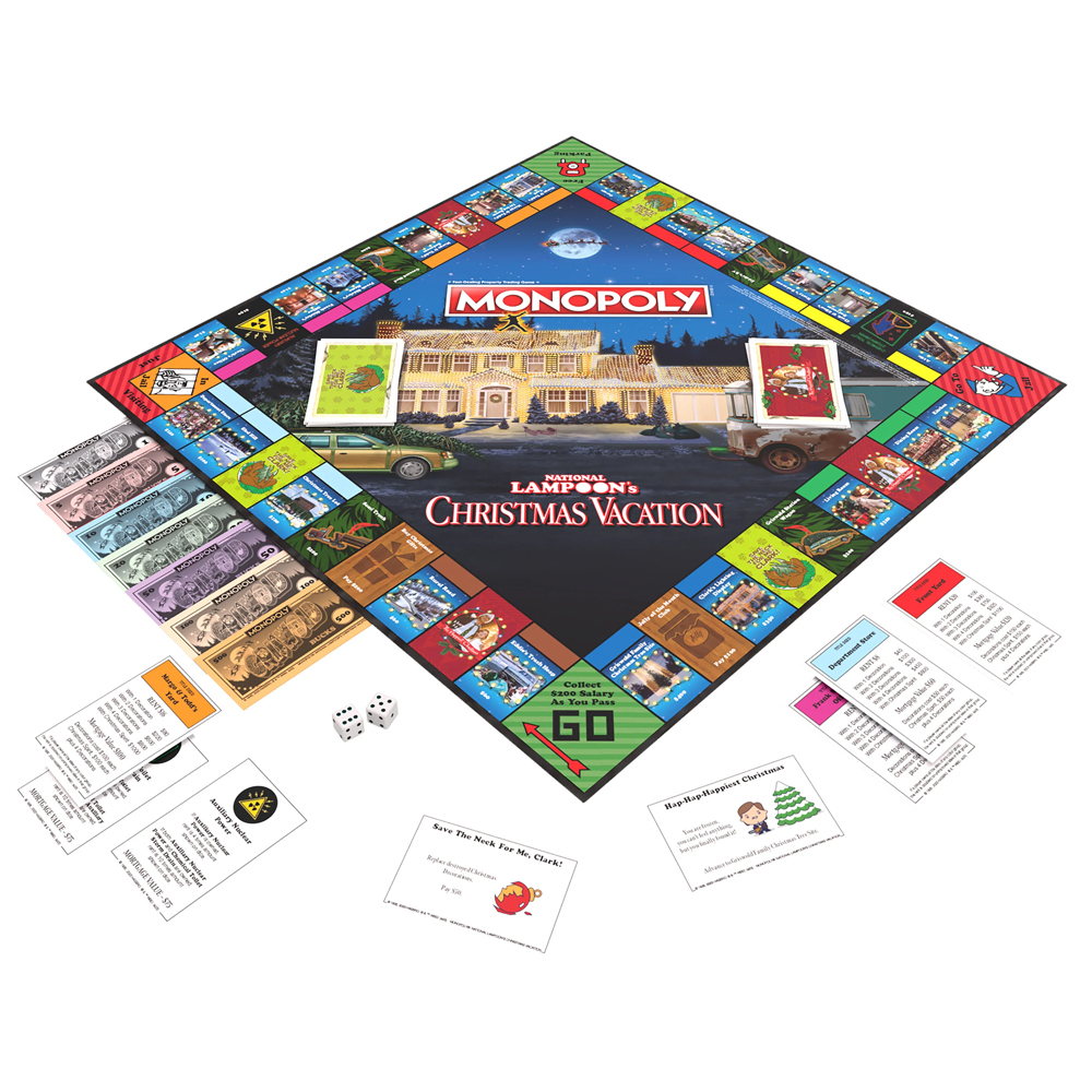 MONOPOLY: National Lampoon's Christmas Vacation lets players buy, sell, and trade locations from the hilarious holiday classic, such as Clark's Lighting Display, Griswold Family Christmas Tree Site, and more. Travel the board with custom movie-inspired tokens including a dry turkey, chainsaw, or squirrel to set up Decorations and Christmas Spirit. Dodge costly Chemical Toilet Storm Drain and Jelly of the Month payments and be the last player with Griswold Bucks to win!