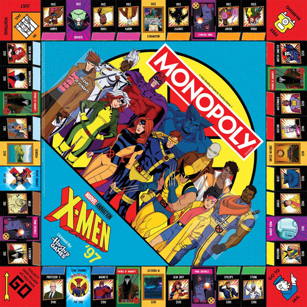 Monpoly: Men '97! Buy , sell, and trade to build your ultimate mutant team with Cable, Wolverine, Jean Gray , Magneto, and Morph. Featuring 6 custom sculpted tokens - Cyclops' Lense, Gambit' s Cards, Magneto' s Helmet, Storm' s Bolt, Wolverine' s Mask, and Rogues' Gloves! Chance and Community Chest (Renamed Human and Prime Sentinels) cards unleash unexpected twists, from gaining new powers to facing off against classic villains. With stunning artwork inspired by the beloved animated series, this edition is a must-have for fans. Enjoy a nostalgic journey filled with thrilling challenges and epic battles!