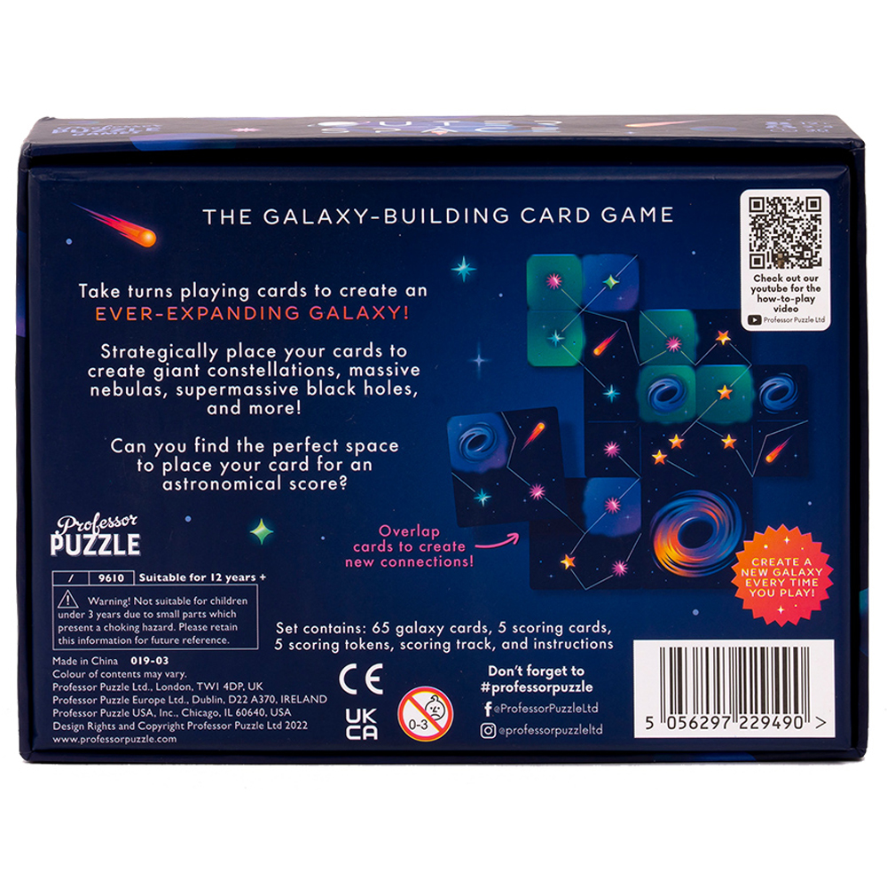 Take turns playing cards to create an ever-expanding galaxy! Strategically place your cards to create giant constellations, massive nebulas, supermassive black holes, and more! Can you find the perfect space to place your card for an astronomical score?