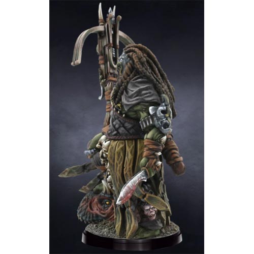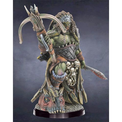 A plastic model on a sprue, this figure does a decent job of hiding mould lines and part gaps. I will say the typical Conquest problem of huge models on itty bitty bases is most telling on this one, with a huge dinosaur skull the only thing allowing for a dynamic pose. Otherwise, crisp detail and a good flow.