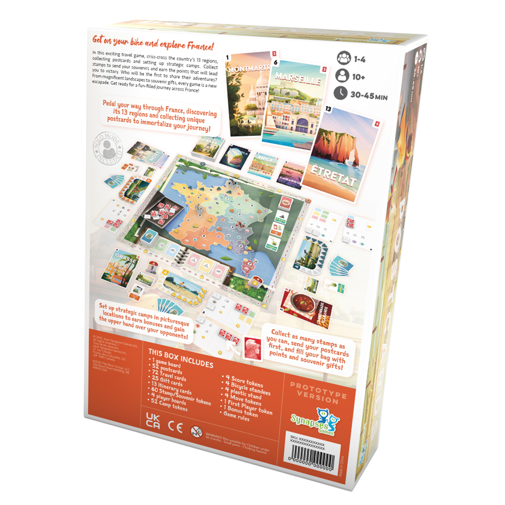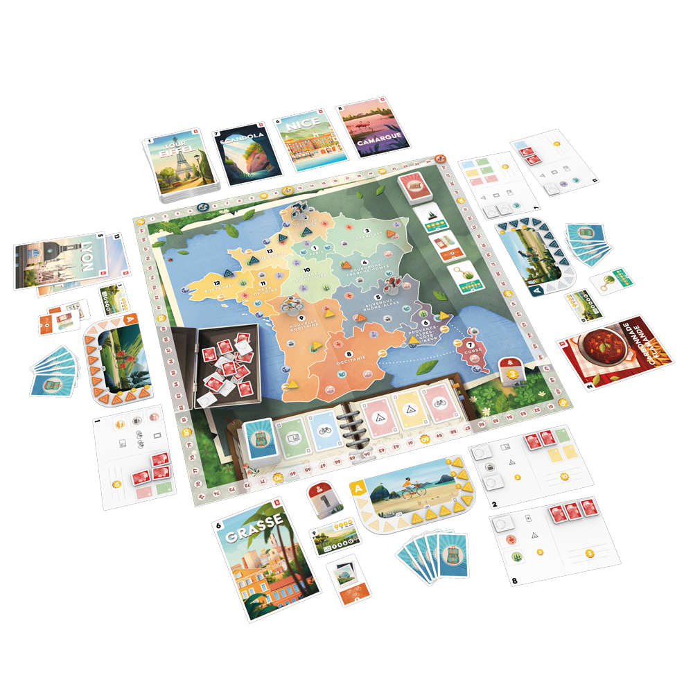 Get on your bike and explore France! In this exciting travel game, criss-cross the country's 13 regions, collecting postcards and setting up strategic camps. Collect stamps to send your souvenirs and earn the points that will lead you to victory. Who will be the first to share their adventures? From magnificent landscapes to souvenir gifts, every game is a new escapade. Get ready for a fun-filled journey across France!