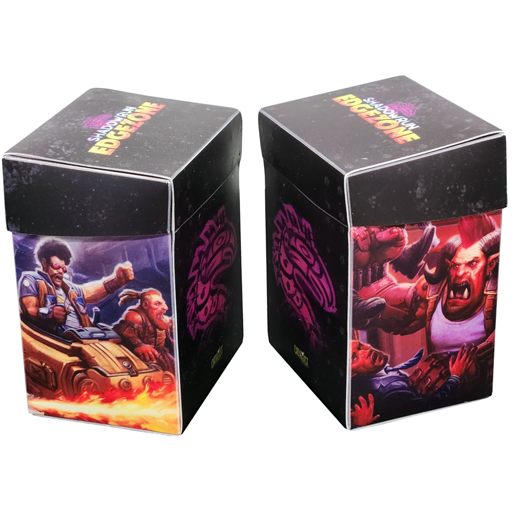 Two themed deck boxes for holding Shadowrun Edge Zone cards, or any standard poker sized cards.