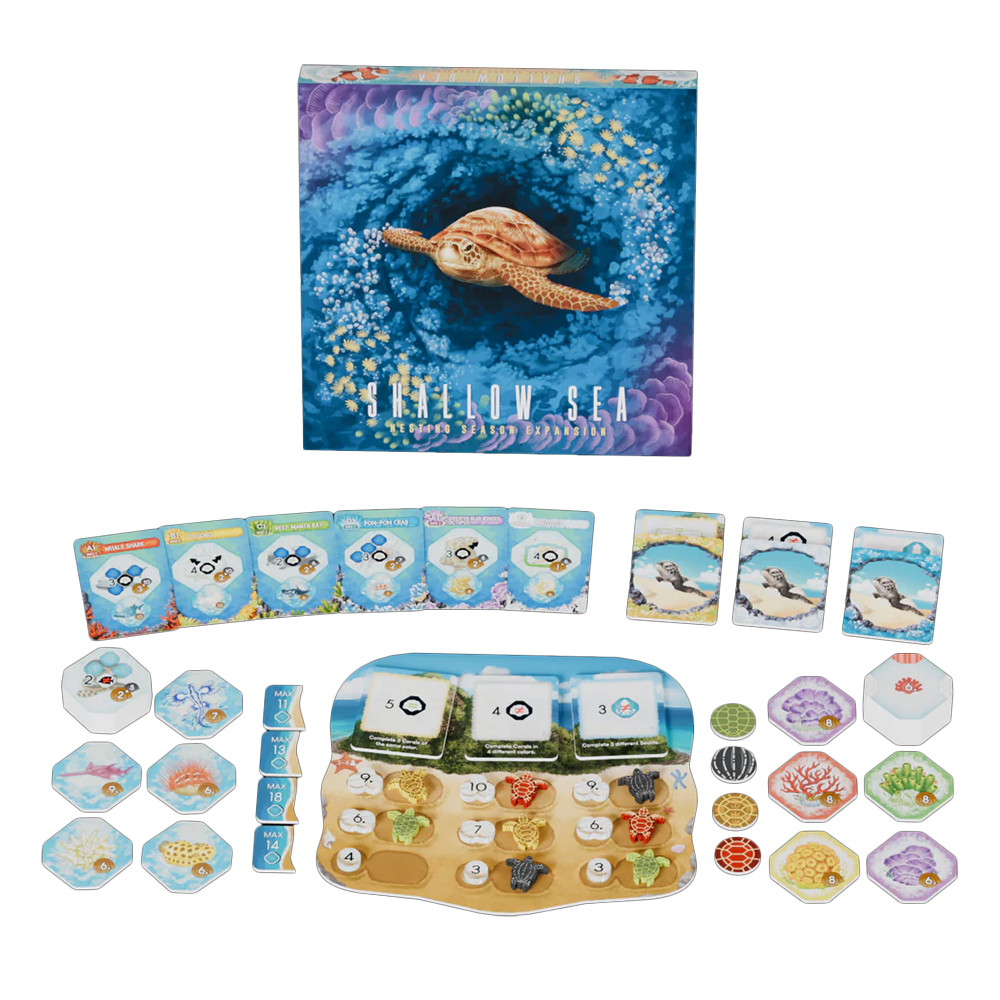Nesting Season Expansion introduces exciting competitive interaction between players. By creating a thriving underwater ecosystem, players can empower turtles to brave the shores and lay their precious eggs. Guide your sea turtles to the ideal nesting grounds! With an extensive selection of brand-new Sealife, Ecosystem Cards, and Corals, enrich your gameplay experience!