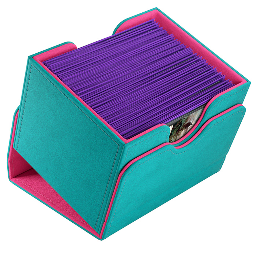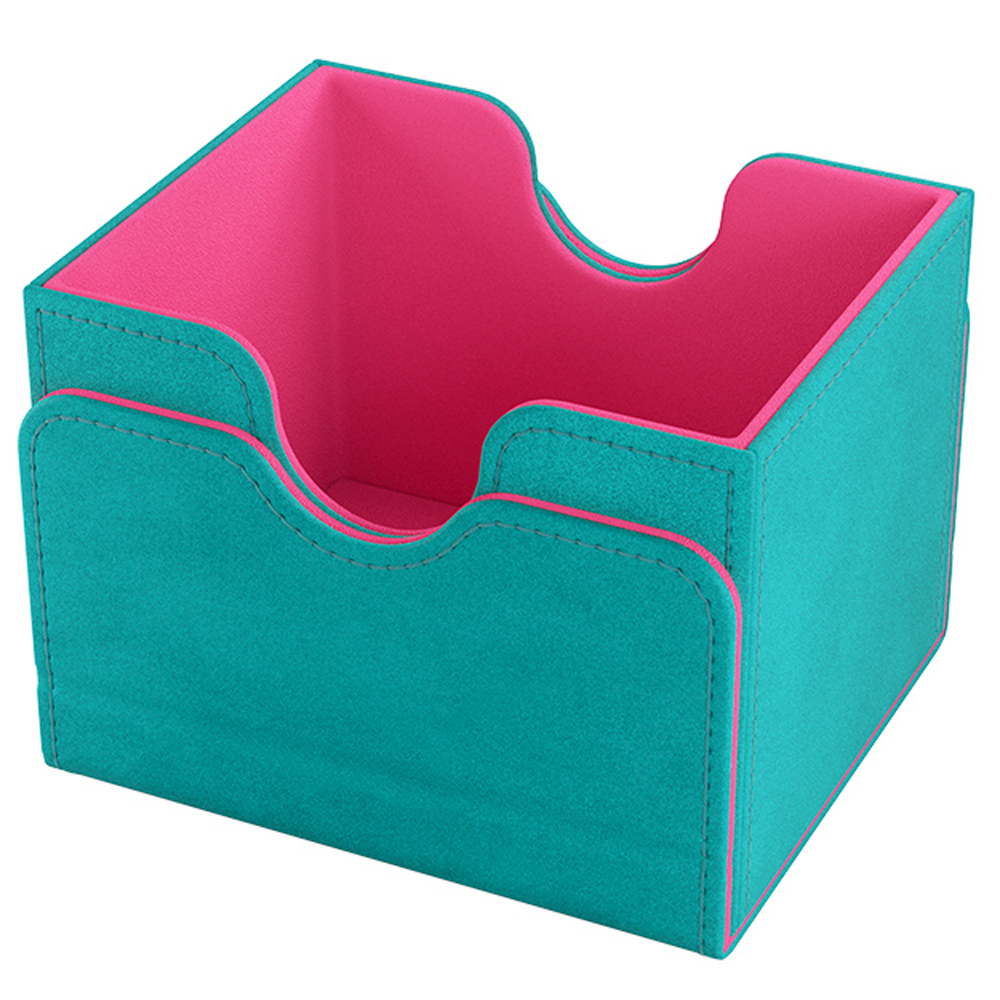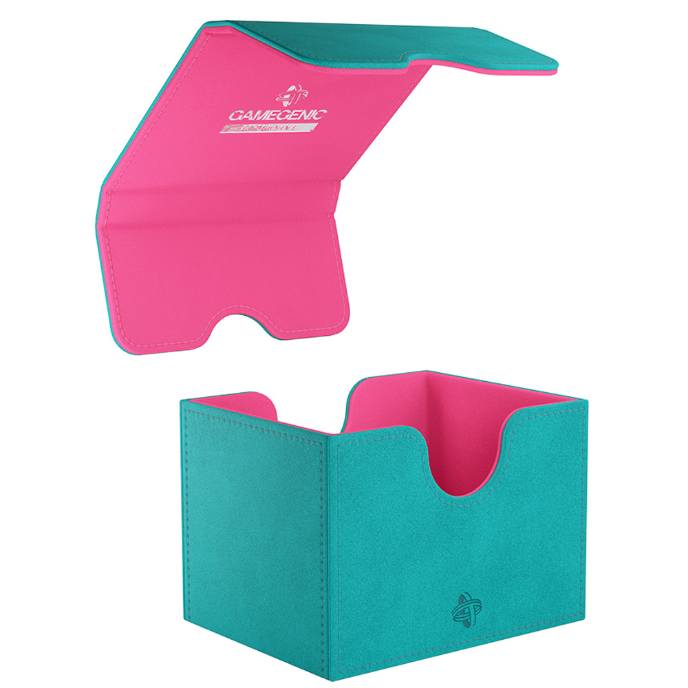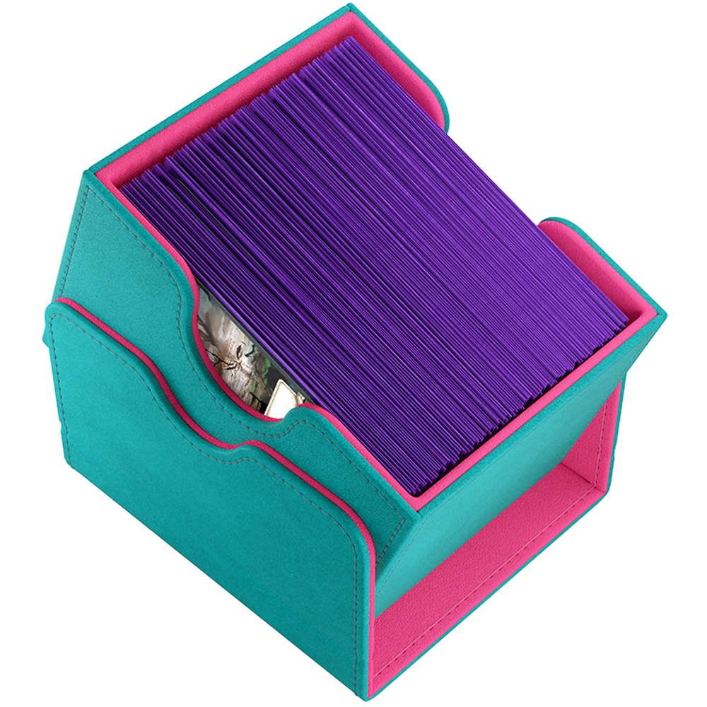 The Sidekick 100+ XL is made to fit 100 double sleeved cards in extra Thick Inner Sleeves. Elegant outside material in TEAL Nexofyber+ with soft PINK microfiber inner lining create a new striking color combination! The Convertible line is designed to present cards in unique ways. Remove the lid, attach it to the bottom or start tilting your box in a wide variety of ways. Powerful magnets keep it safely closed.