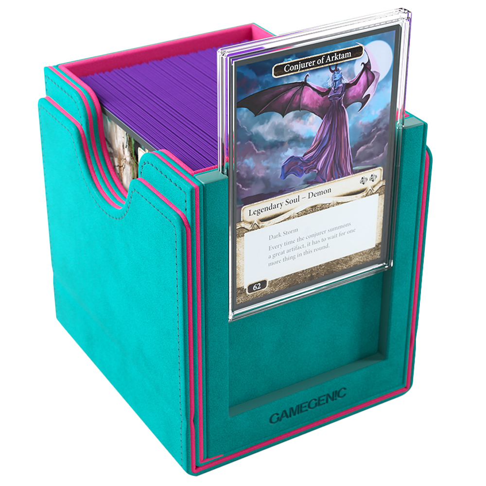 Magic: The Gathering format "COMMANDER". It includes a Slide Card Case for displaying the Commander or top card with additional UV protection. Due to the innovative placement, the stored deck can be easily identified without opening the box. The Slide Card Case can also be detached and used during gameplay. The integrated drawer holds additional tokens and other accessories. The Sidekick PRO holds 100 double-sleeved cards in extra Thick Inner Sleeves. It can also fit 100 regular double-sleeved cards and has extra room for token cards. This premium box is also equipped with our highly rated convertible system: The completely removable cover clips onto the bottom, saving precious space on the gaming table.