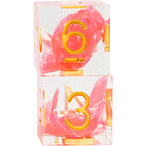 These dice are clear and feature a pink and a gold swirling ball at their core.