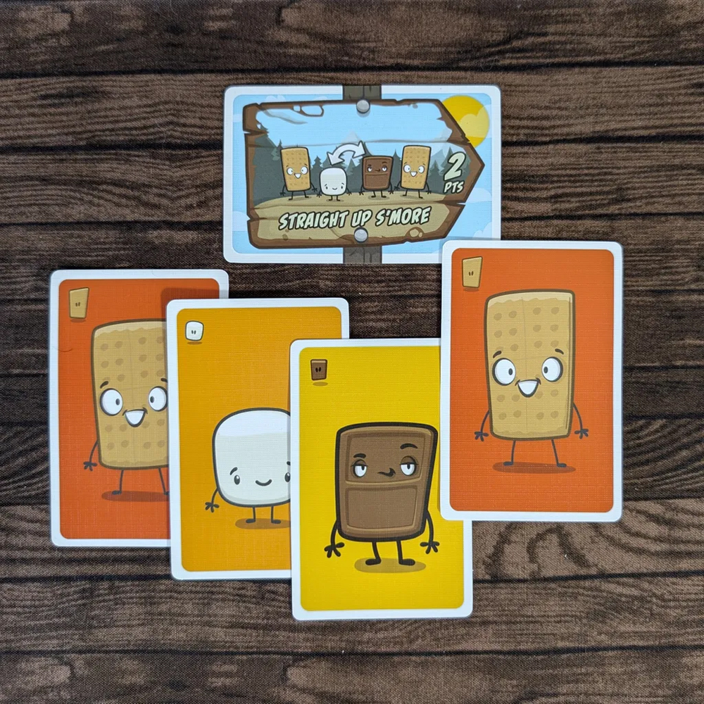 In S'mores Galore, players compete to score the most points. You score points by making S'mores. To make S'mores, you'll first have to grab graham crackers, chocolate, and marshmallow cards from a grid on the table. You'll have to stack them in your line-up in the order you pick them up to create the perfect S'mores. With some clever hand management, you can score a lot of S'mores and win the game.