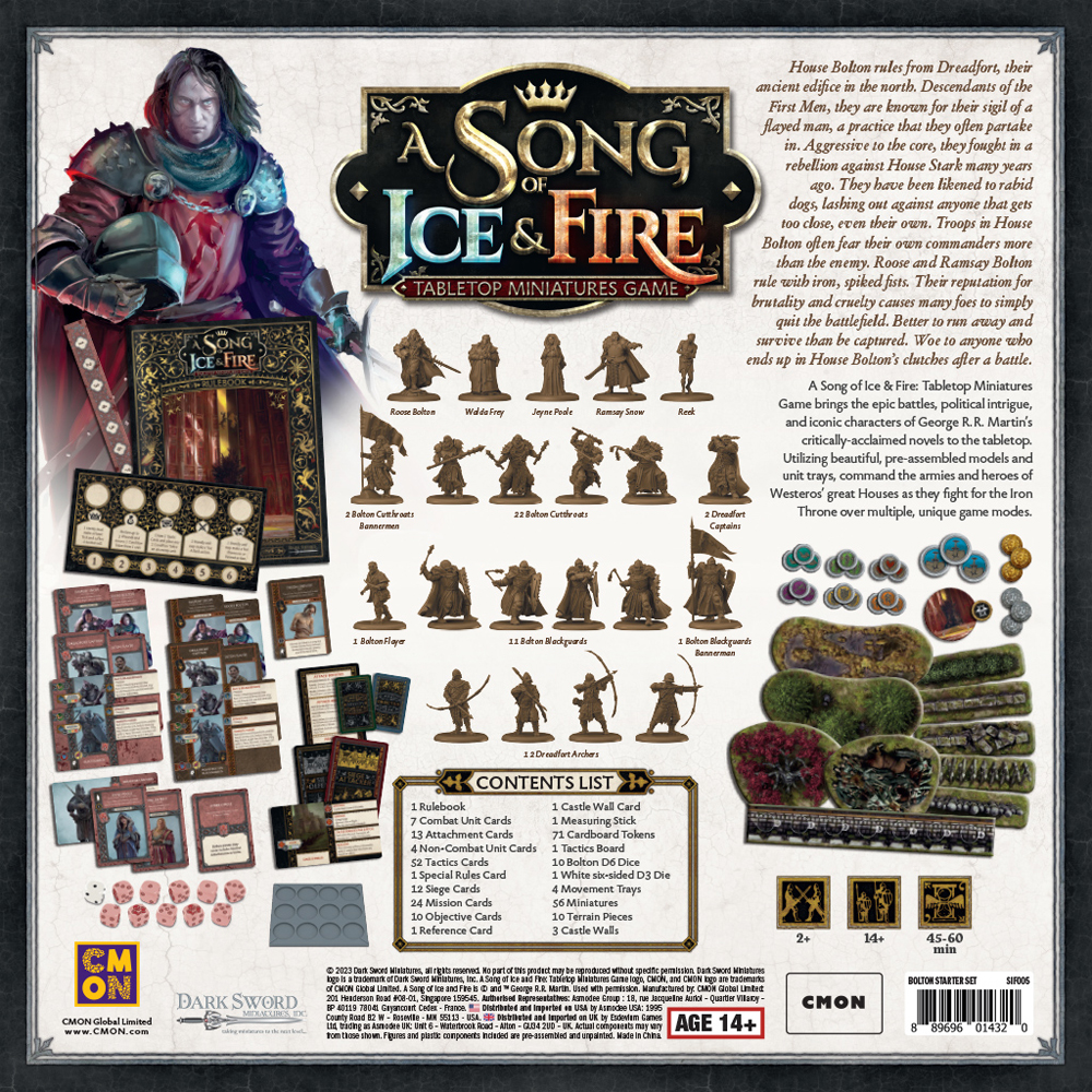 The Bolton starter set is a great introduction to the game. You get 4 units (2x Cutthroats, 1x Blackguard, and 1x Dreadfort Archers), 4 NCUs, Bolton tactics deck and neutral tactics deck. Dice, terrain, tokens, etc. Faction is fun to play and gives you three units you can use in other armies. Package arrived quickly and in good condition.