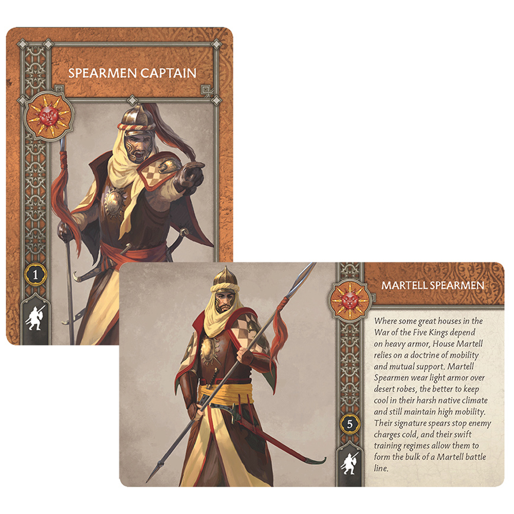 In the spectrum of armor versus mobility, House Martell has gone to one extreme. Though lightly armored for line-of-battle troops, House Martell's Spearmen are fleet-of-foot and trained in mutual support tactics. Their signature spears stop enemy charges cold, and their superior numbers allow them to form the bulk of a Martell battle line. This makes for a unit that can, with sufficient numbers, hold the line and rapidly react to events unfolding on the battlefield. That said, a commander would do well to keep them supported at all times, allowing them to do their best work.
