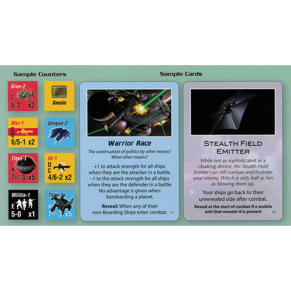 Titans, super large ships beyond dreadnaught, make their appearance and can both carry fighters and destroy planets, but have liabilities too. As requested, fleet counters and a fleet display are in the box. In addition to racial advantages, there are also unique Technological Advantages. There are more technologies and some more money is added into the game because of the larger tech tree.