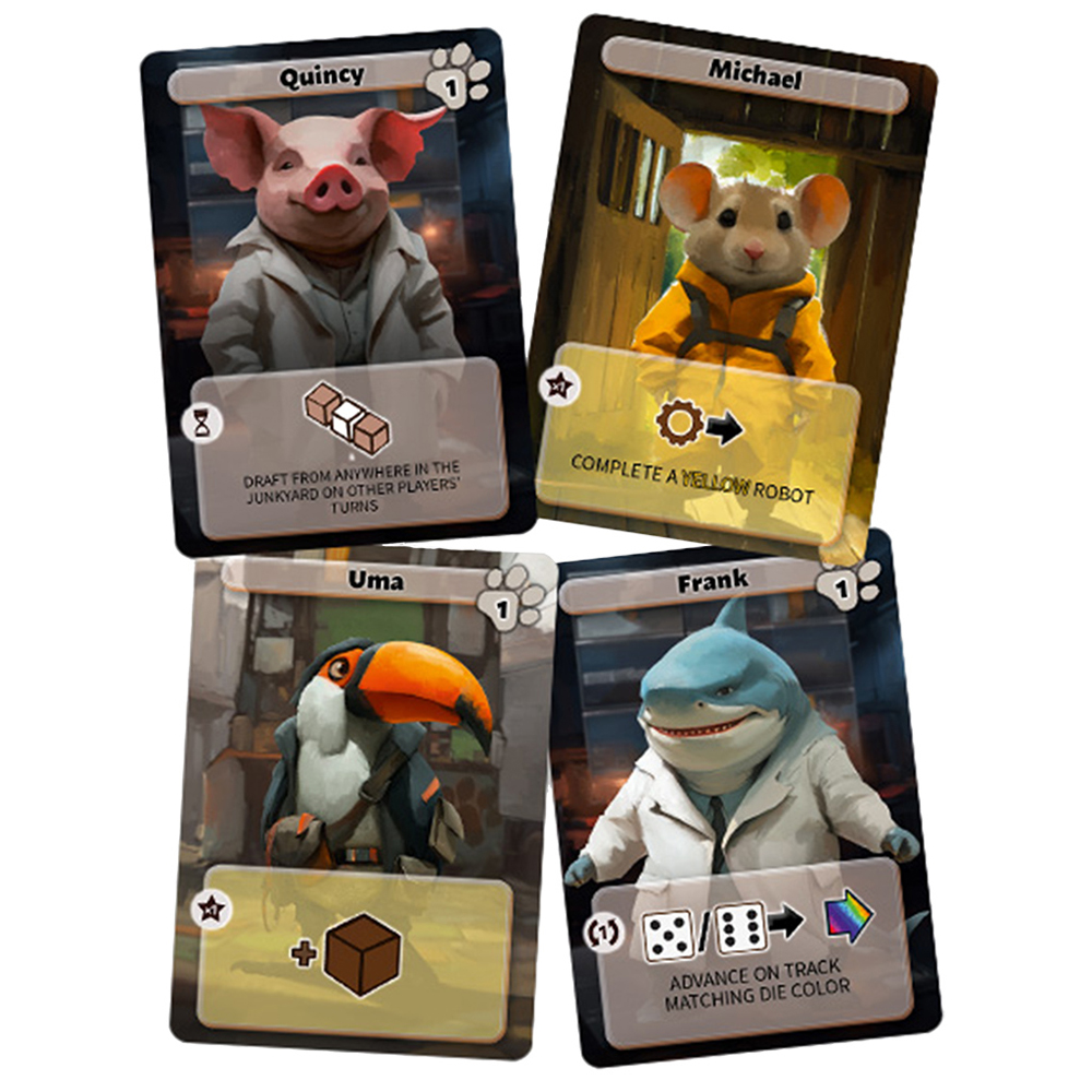 Players can also use spark to activate the abilities of their completed robots, or use cogs to recruit their animal assistants. You start the game with six assistants, each with a unique ability, and you should shape your strategy around them. The variety of assistants ensures that each game provides a different challenge. In the advanced game, players draft the assistants, providing more strategic options.