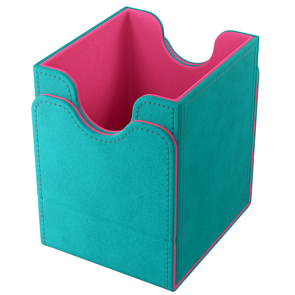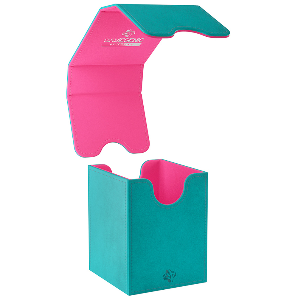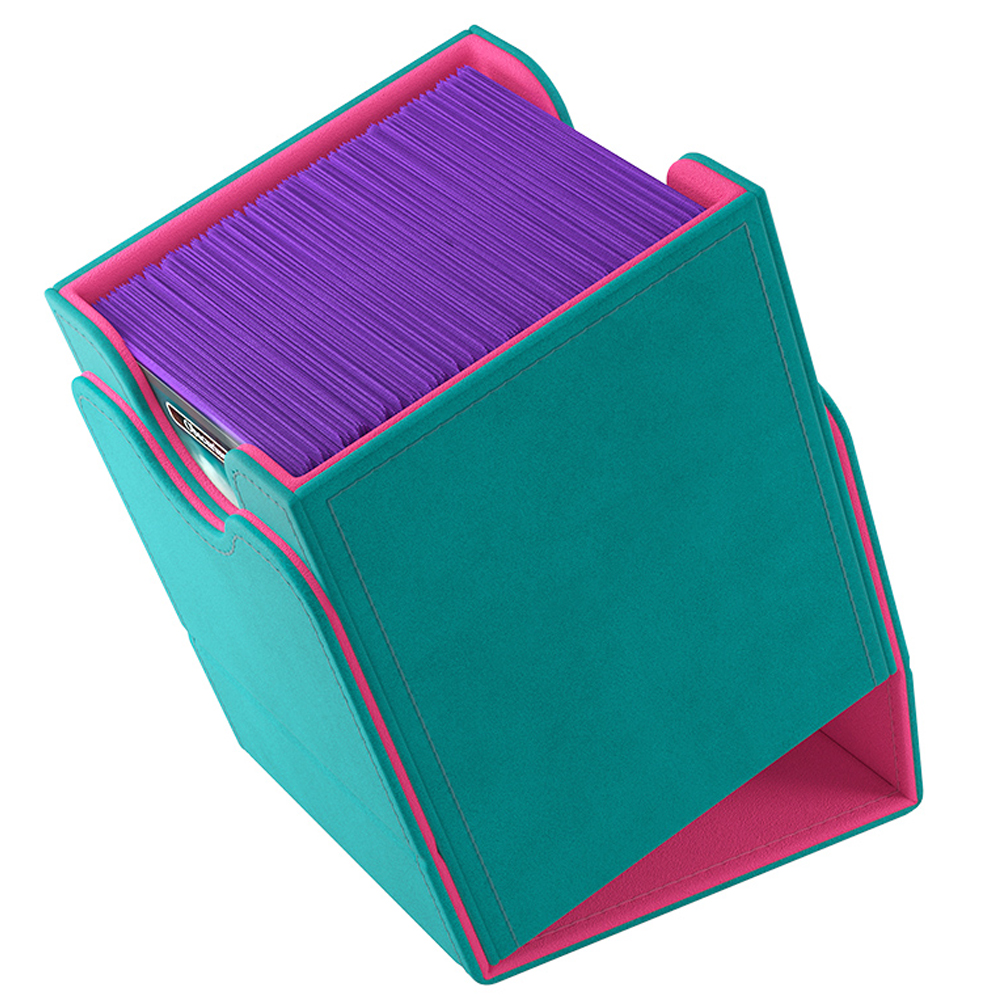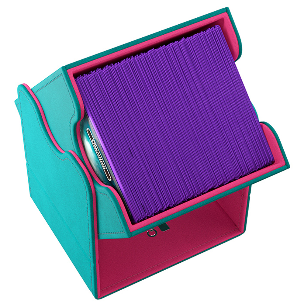 The Squire 100+ XL is made to fit 100 double sleeved cards in extra Thick Inner Sleeves. Elegant outside material in TEAL Nexofyber+ with soft PINK microfiber inner lining create a new striking color combination! The Convertible line is designed to present cards in unique ways. Remove the lid, attach it to the bottom or start tilting your box in a wide variety of ways. Powerful magnets keep it safely closed.